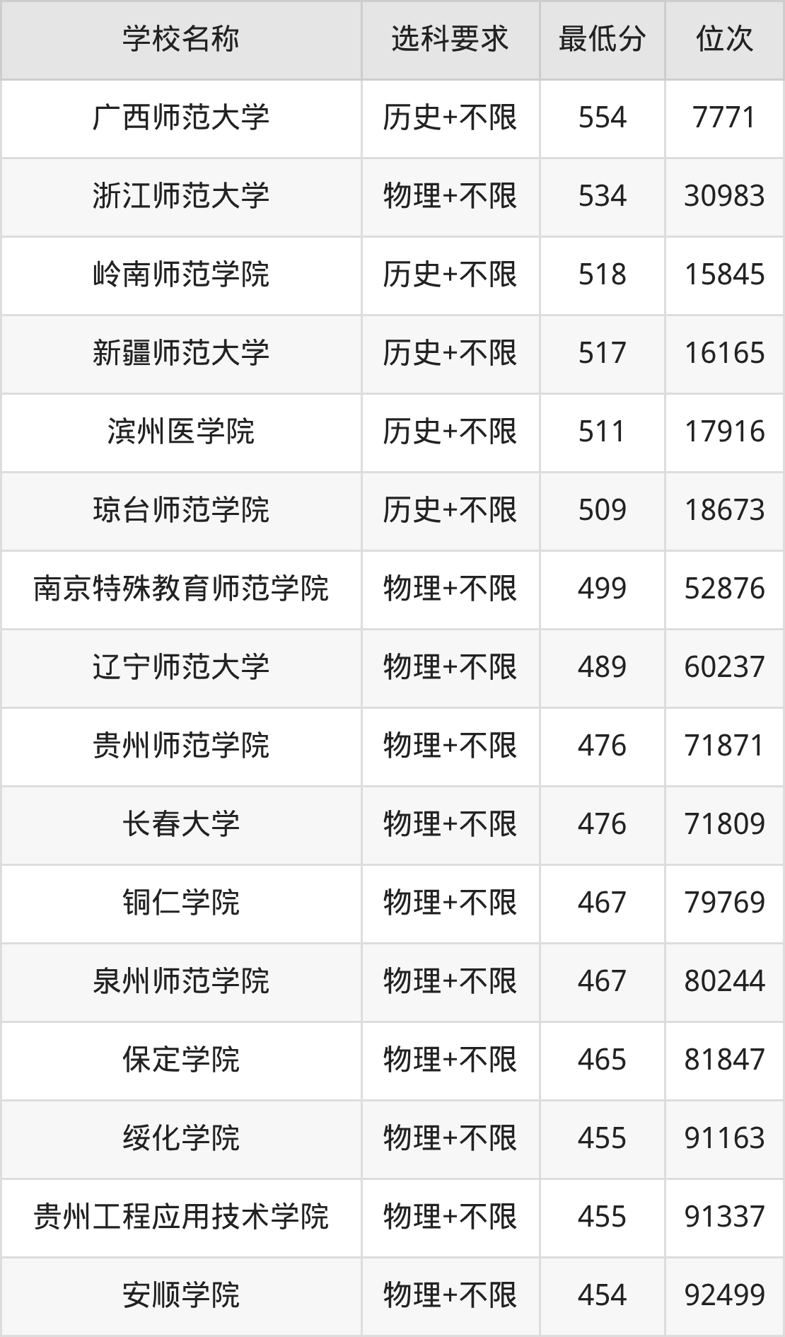 在贵州招生的院校中,有13所不限选科要求(物理组),如浙江师范大学、南京特殊教育师范学院等;有5所不限选科要求(历史组),如广西师范大学、岭南师范学院等。