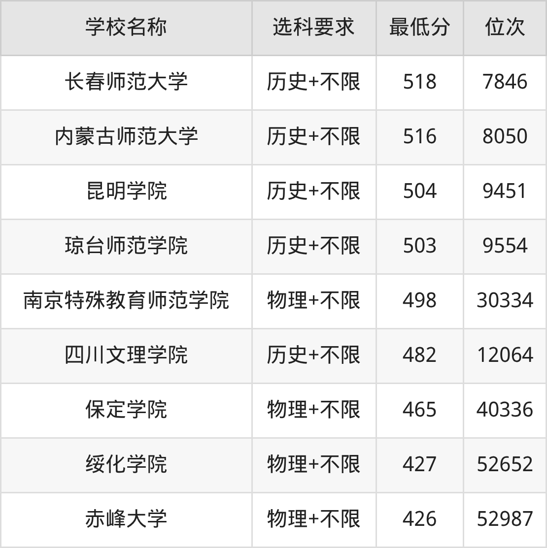 在内蒙古招生的院校中,有5所不限选科要求(历史组),如长春师范大学、内蒙古师范大学等;有4所不限选科要求(物理组),如南京特殊教育师范学院、保定学院等。