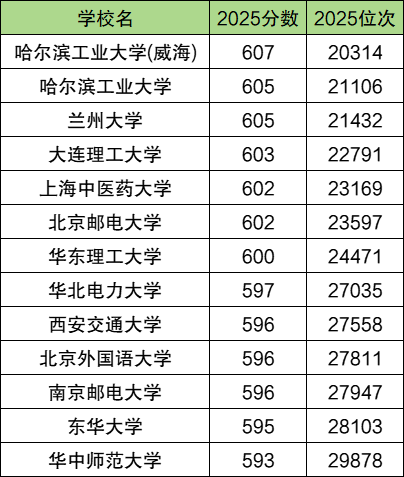 山东2万-3万名对应的大学一共有13所,在此范围内,最高位次对应的大学是哈尔滨工业大学(威海),最低录取位次为20314位,位次对应分数为607分;