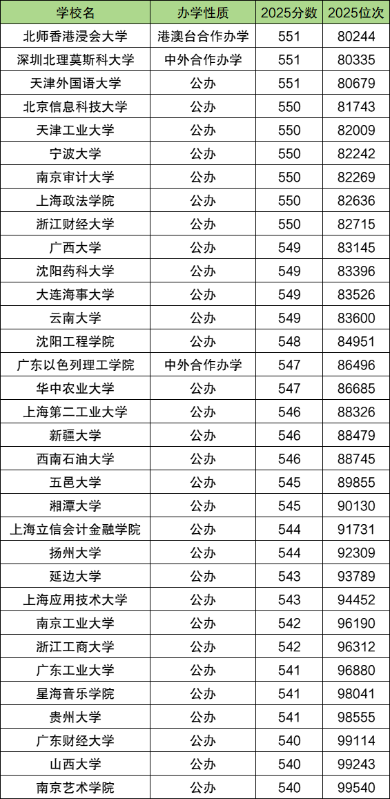 8万-10万名中最低位次对应的大学是南京艺术学院,最低录取位次为99540位,位次对应分数为540分。