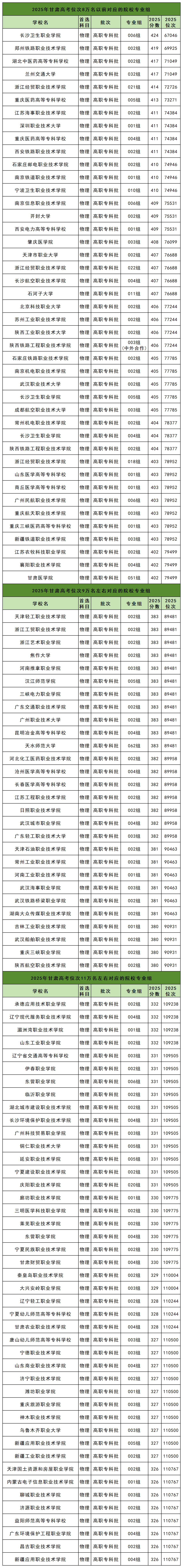 物理类位次排名8万名以前对应的专科院校专业组有43个,分数线在402分到424分不等。其中分数线最高的院校专业组是长沙卫生职业学院006组,2025年最低录取位次为67046名。分数线最低的院校专业组是甘肃医学院051组、襄阳职业技术学院004组等,2025年最低录取位次为79499名。