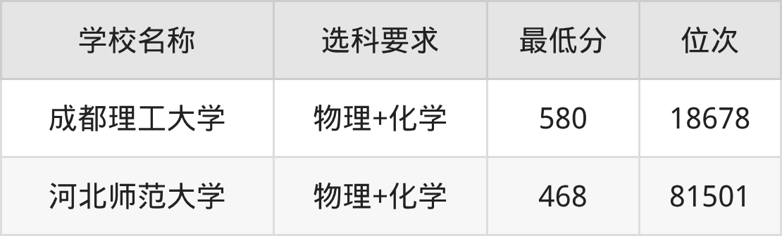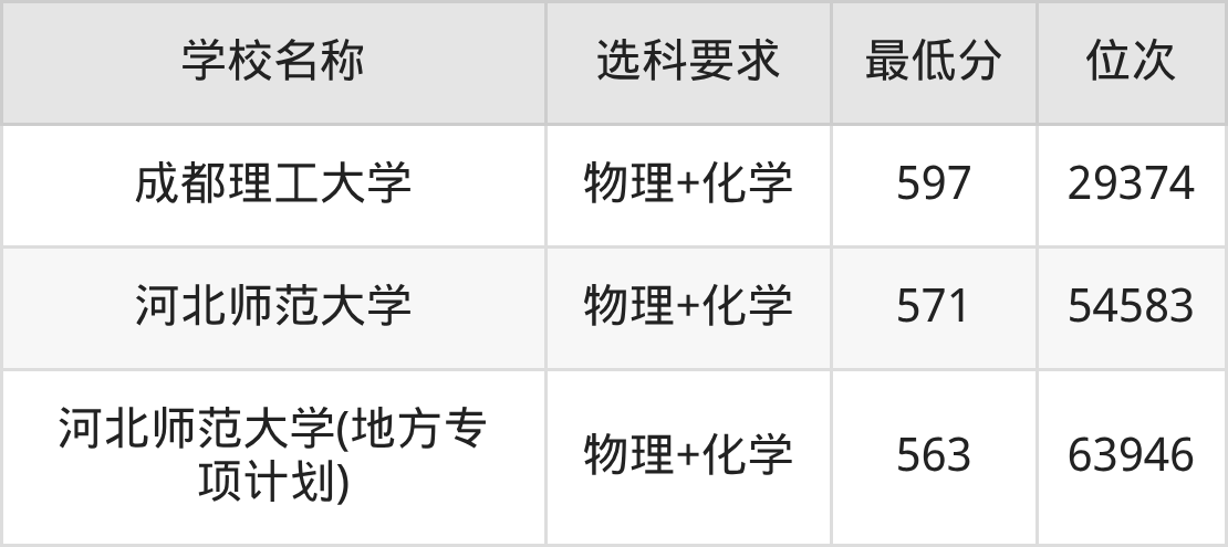 在河北招生的院校中,有3所要求考生必选“物理+化学”,如成都理工大学、河北师范大学等。