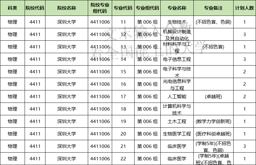 第006组:专业组代码为4411006,包含专业生物技术、机械设计制造及其自动化、材料科学与工程、电子信息工程、电子科学与技术、光电信息科学与工程、人工智能、计算机科学与技术、土木工程、生物医学工程、临床医学、临床医学。