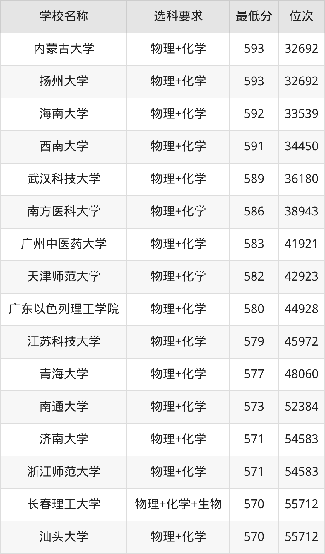 需要注意的是,生物技术专业大学中有55所要求考生必选“物理+化学”,如中山大学、北京科技大学等;有6所要求考生必选“物理+化学+生物”,如长春理工大学、牡丹江医科大学等,因此大家在报考前要提前了解清楚专业选科要求。