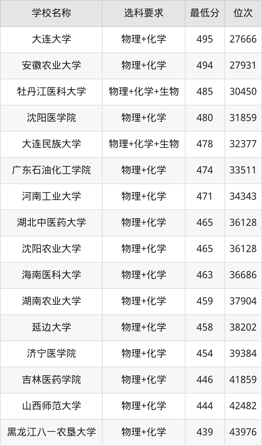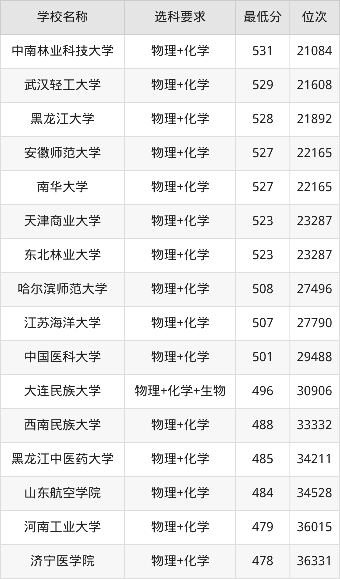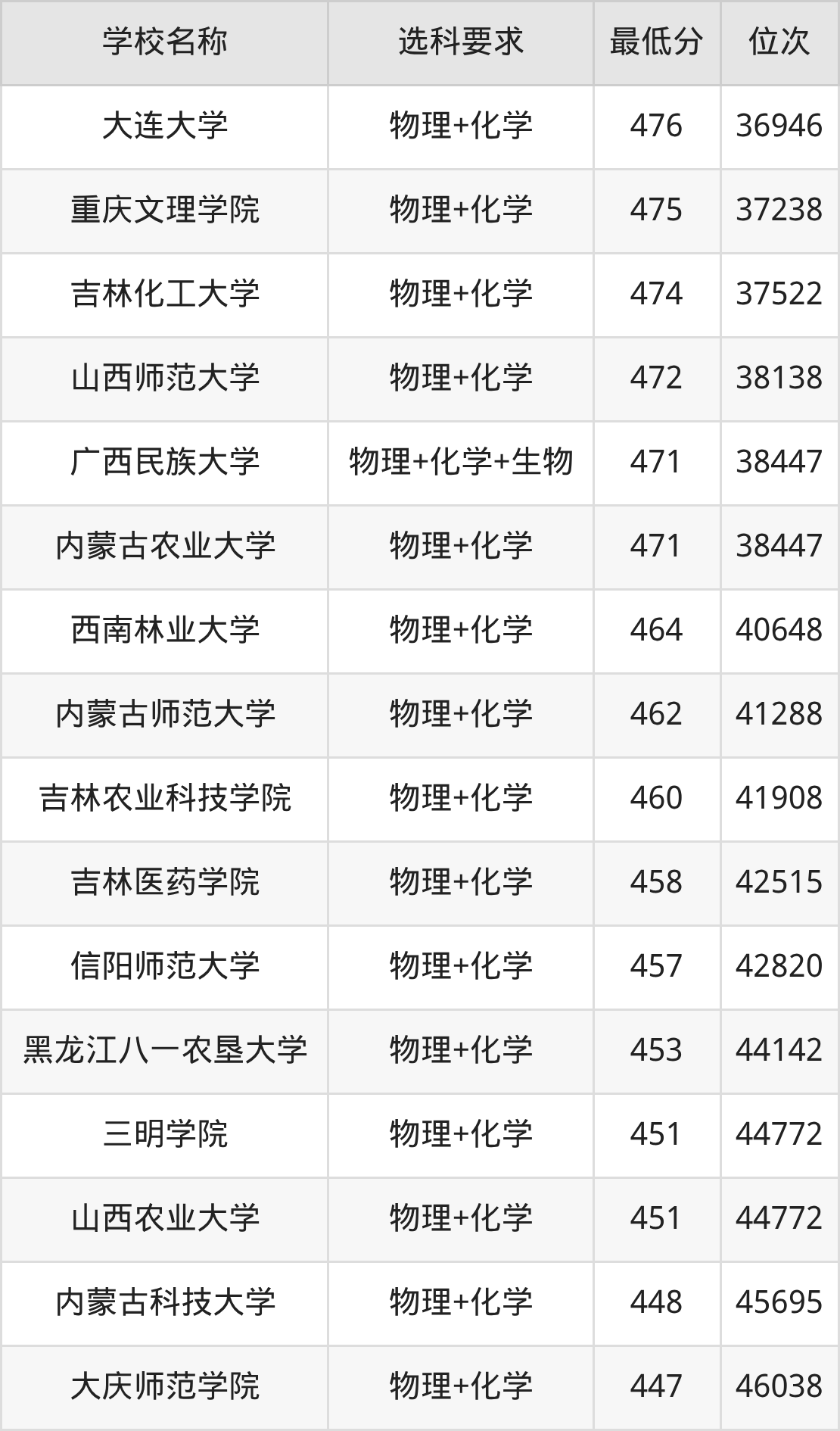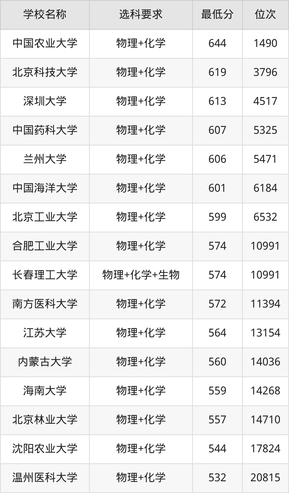 在内蒙古招生的院校中,有55所要求考生必选“物理+化学”,如中国农业大学、北京科技大学等;有7所要求考生必选“物理+化学+生物”,如长春理工大学、大连民族大学等。