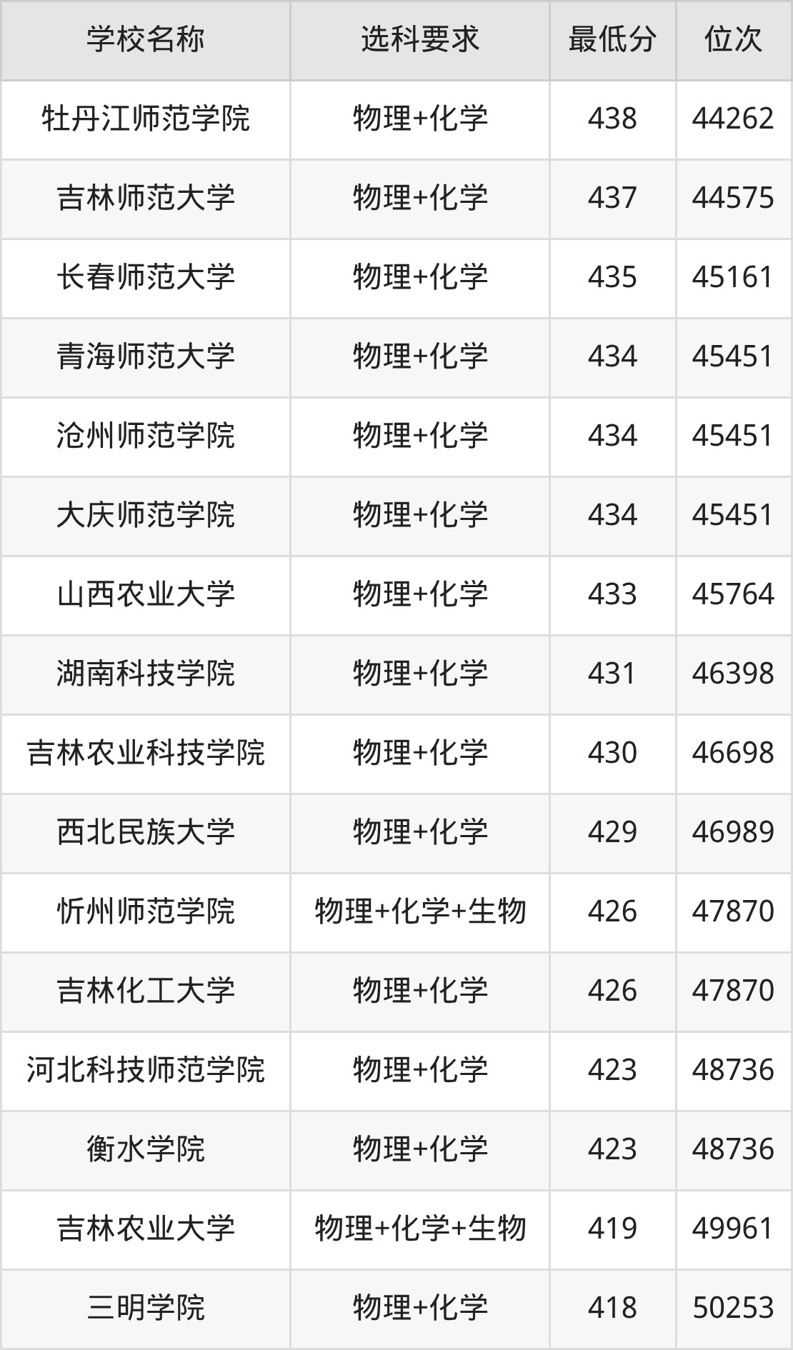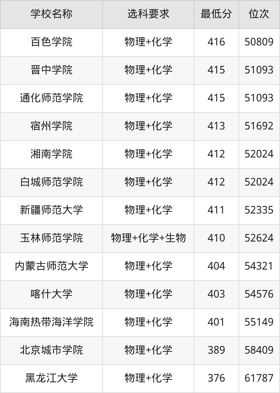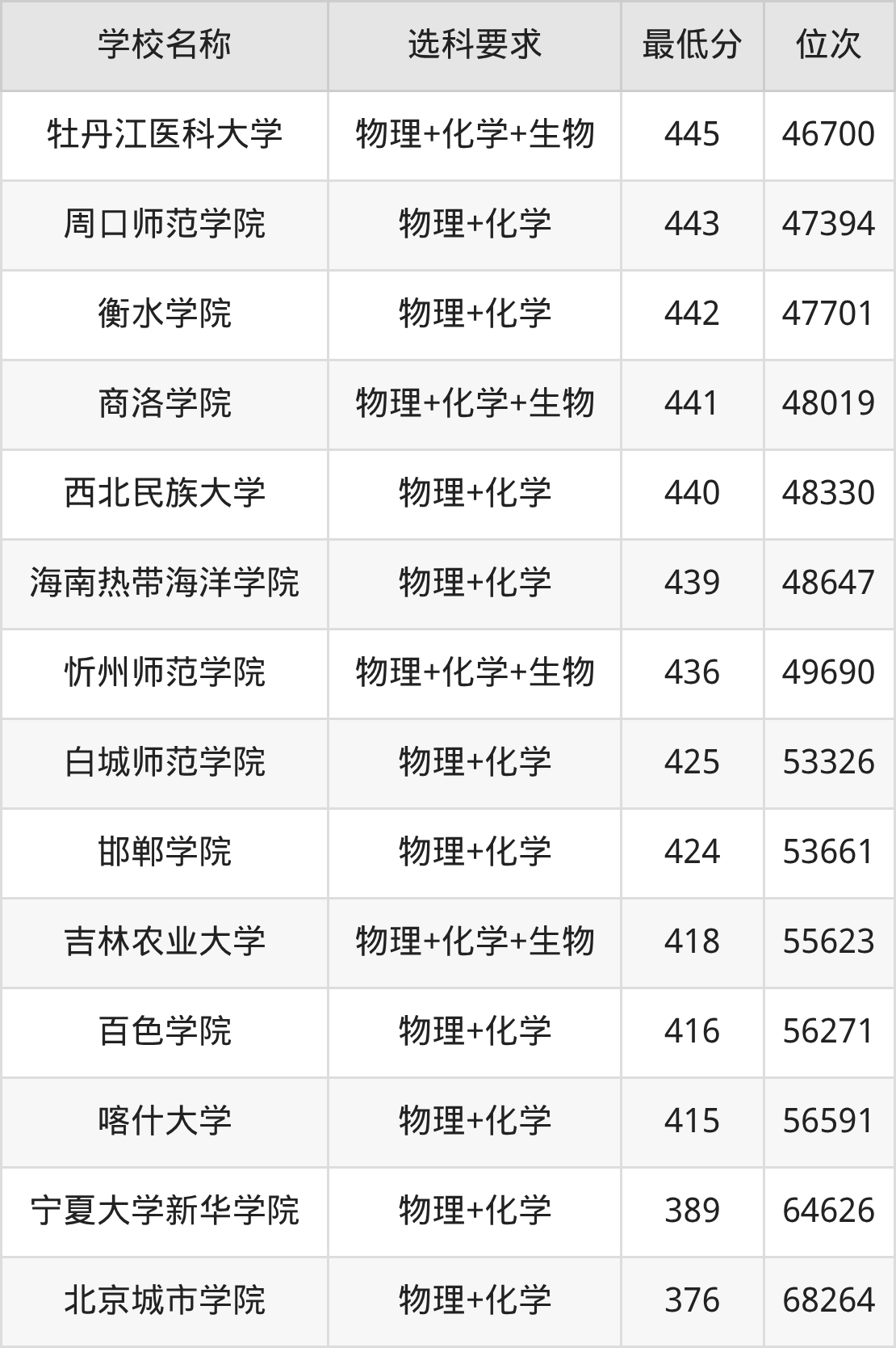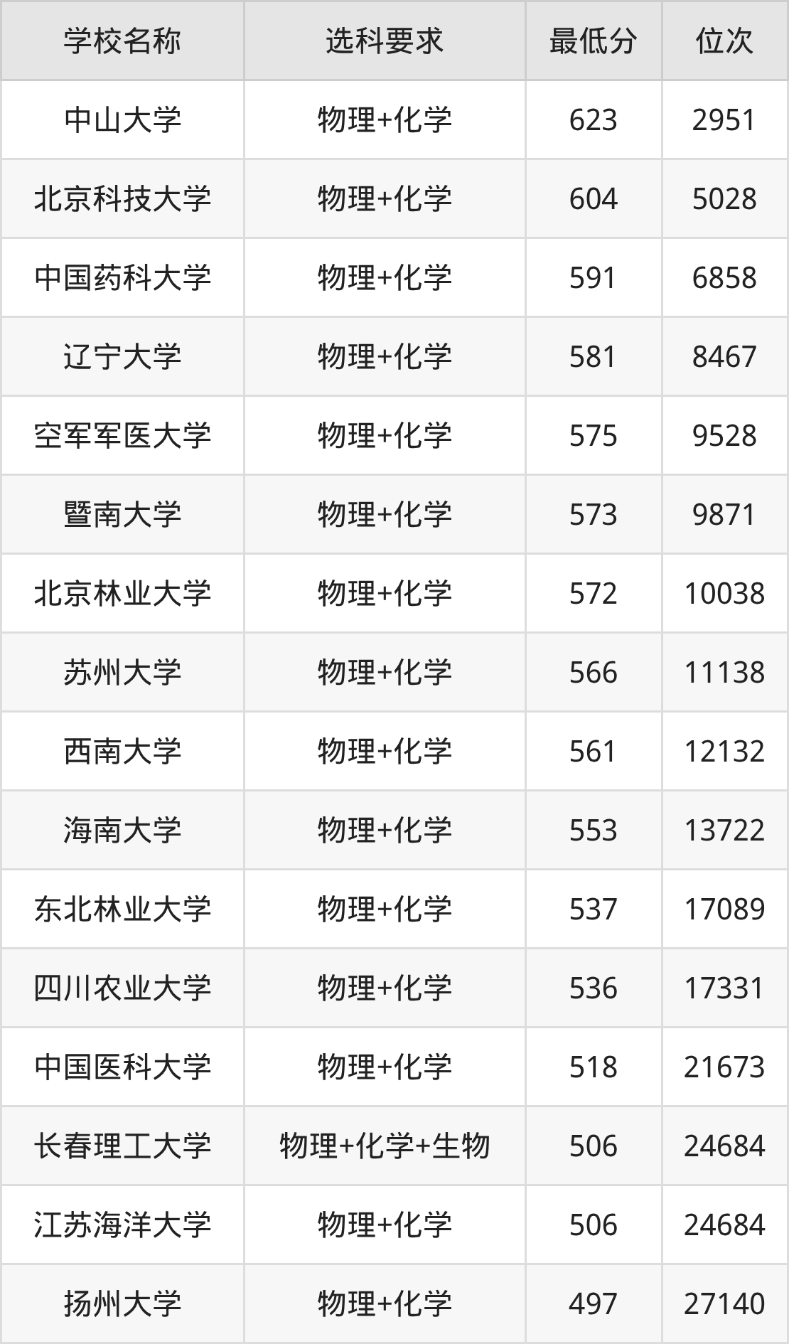 在内蒙古招生的院校中,有55所要求考生必选“物理+化学”,如中国农业大学、北京科技大学等;有7所要求考生必选“物理+化学+生物”,如长春理工大学、大连民族大学等。