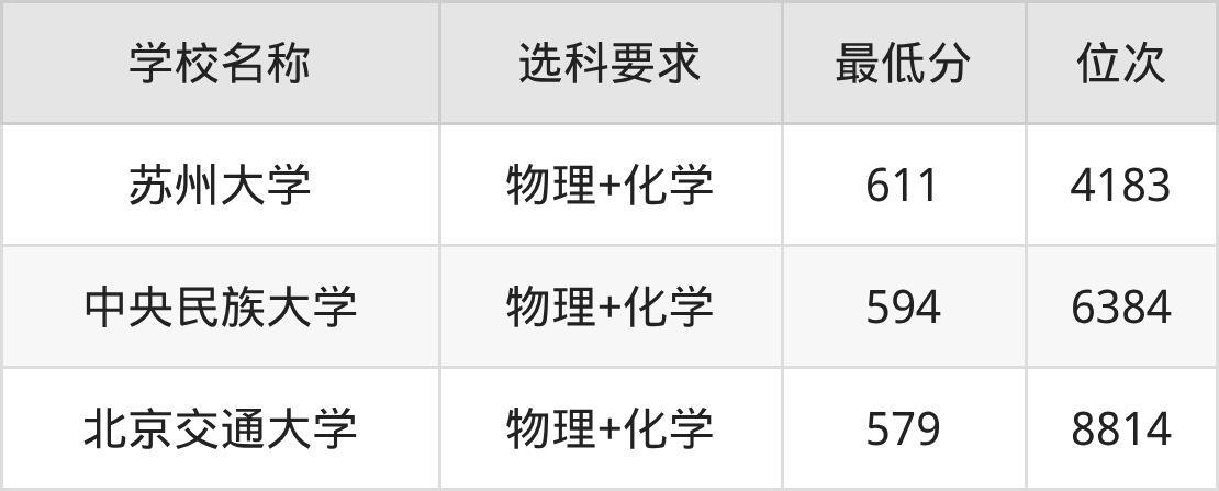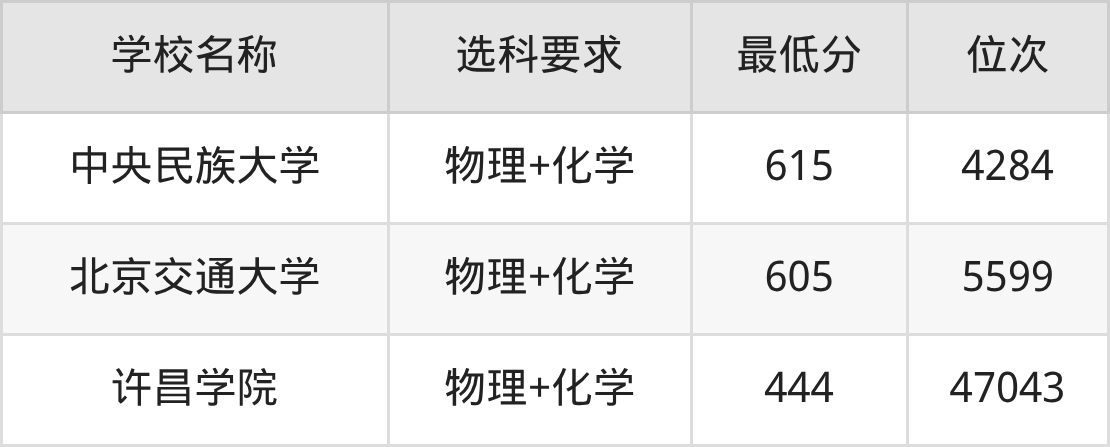 在内蒙古招生的院校中,有3所要求考生必选“物理+化学”,如中央民族大学、北京交通大学等。