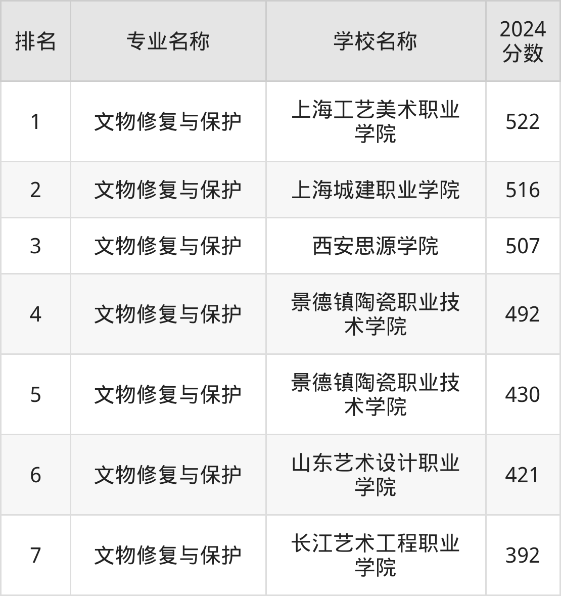 参考2024年山东各专业分数线,各大学文物修复与保护专业的分数线为:上海工艺美术职业学院522分、上海城建职业学院516分等,更多数据详见下文。