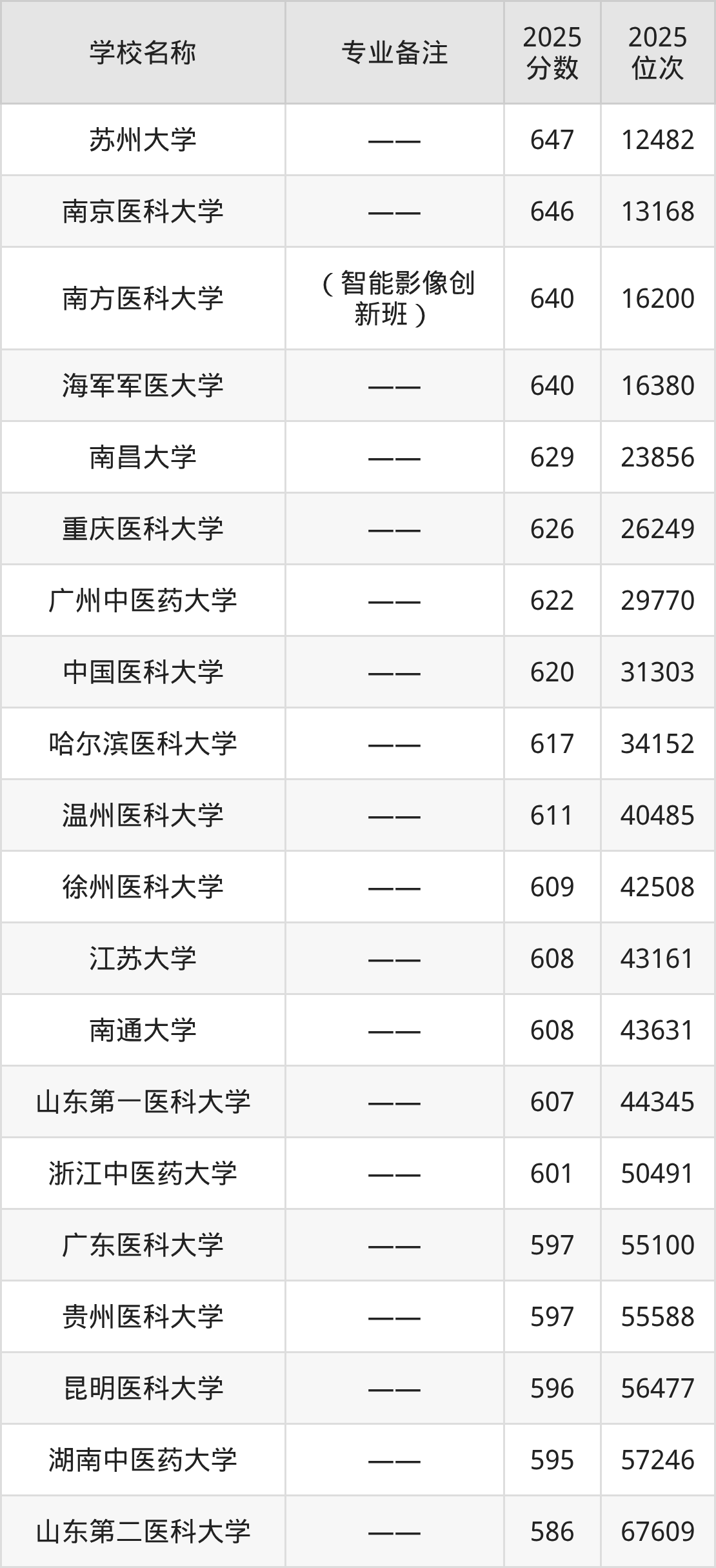 2025年医学影像学大学全国排名为:第1名华中科技大学、第2名东南大学等;各大学医学影像学专业的分数线为:苏州大学647分、南京医科大学646分等,更多数据详见下文。