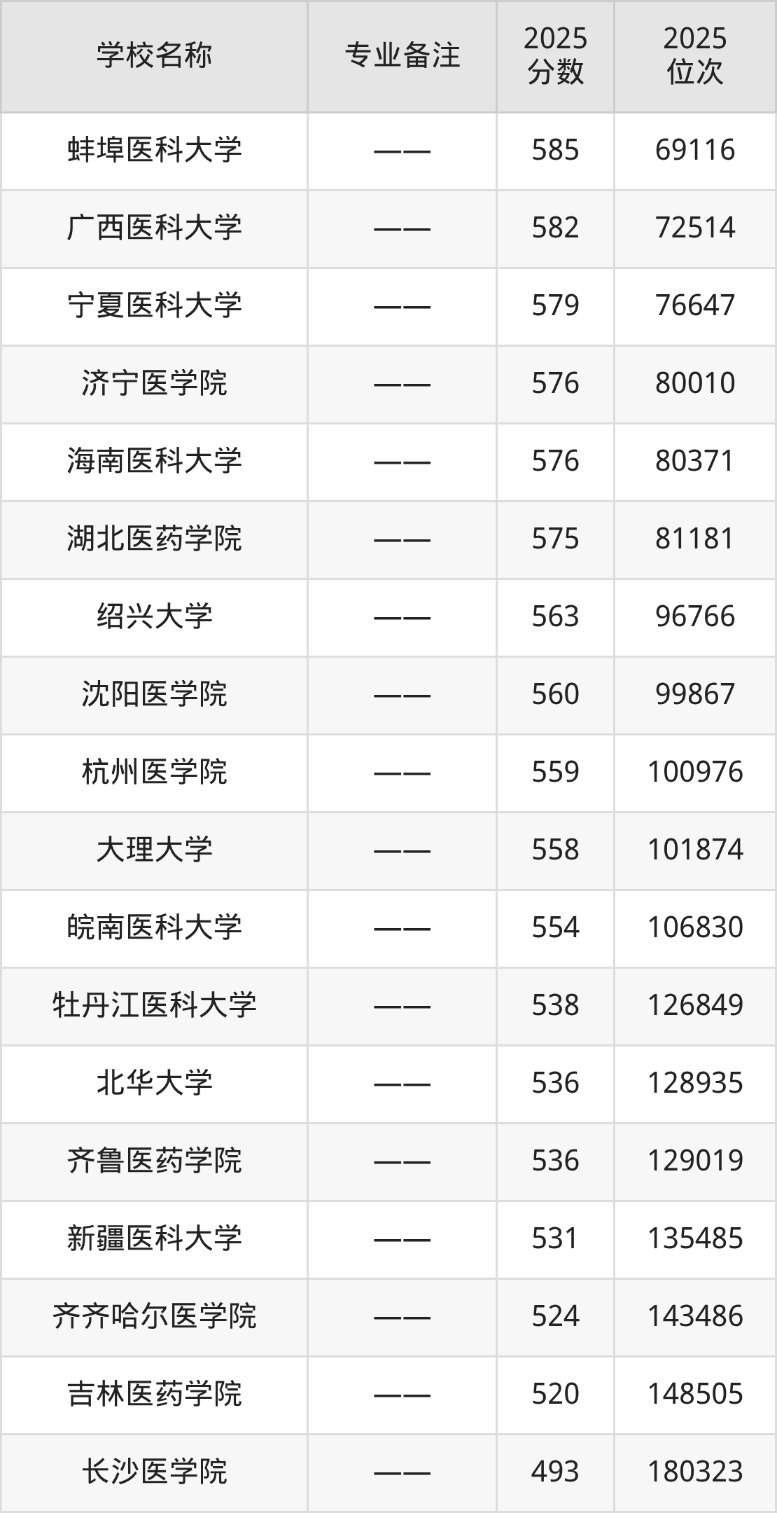 排在第二的医学影像学专业大学是南京医科大学,2025年投档线是646分,最低位次是13168位。