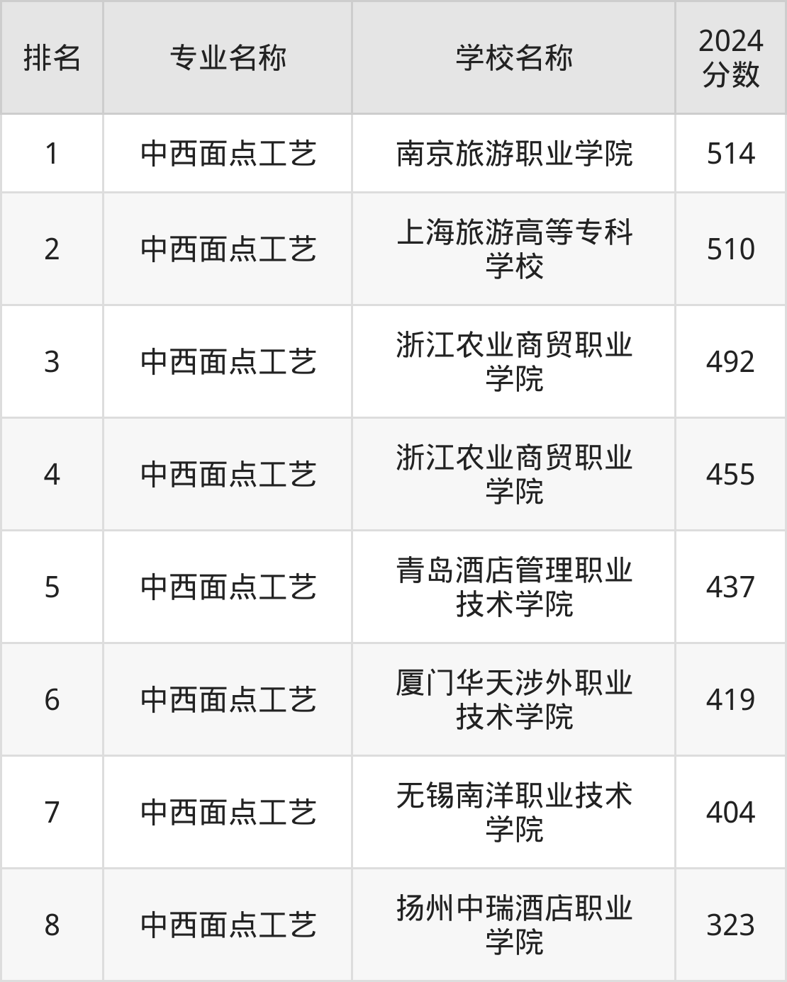 参考2024年山东各专业分数线,各大学中西面点工艺专业的分数线为:南京旅游职业学院514分、上海旅游高等专科学校510分等,更多数据详见下文。