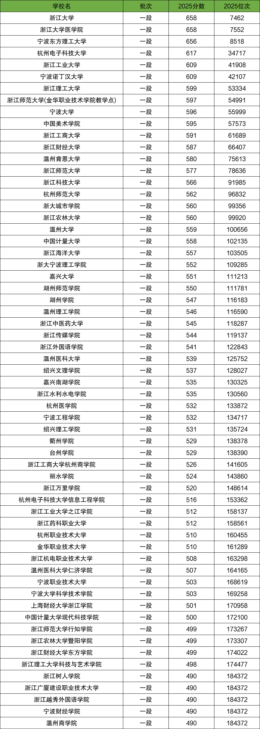 2025年浙江各高校录取分数线如下:一段490分~658分。