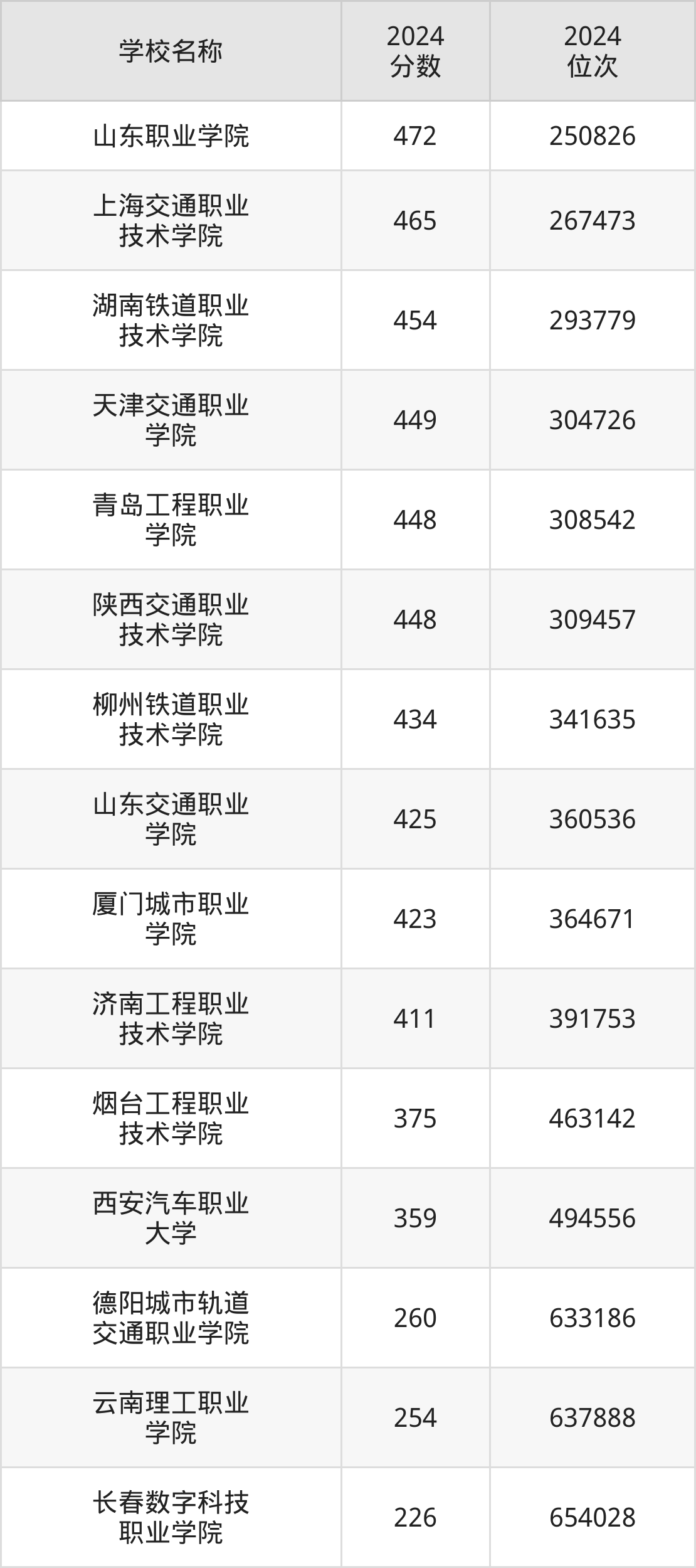 在山东,分数线第一的城市轨道车辆应用技术专业大学是山东职业学院,2024年投档线是472分,最低位次是250826位;