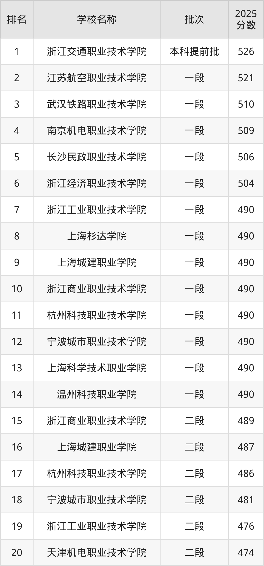 第1名:浙江交通职业技术学院,526分(本科提前批);