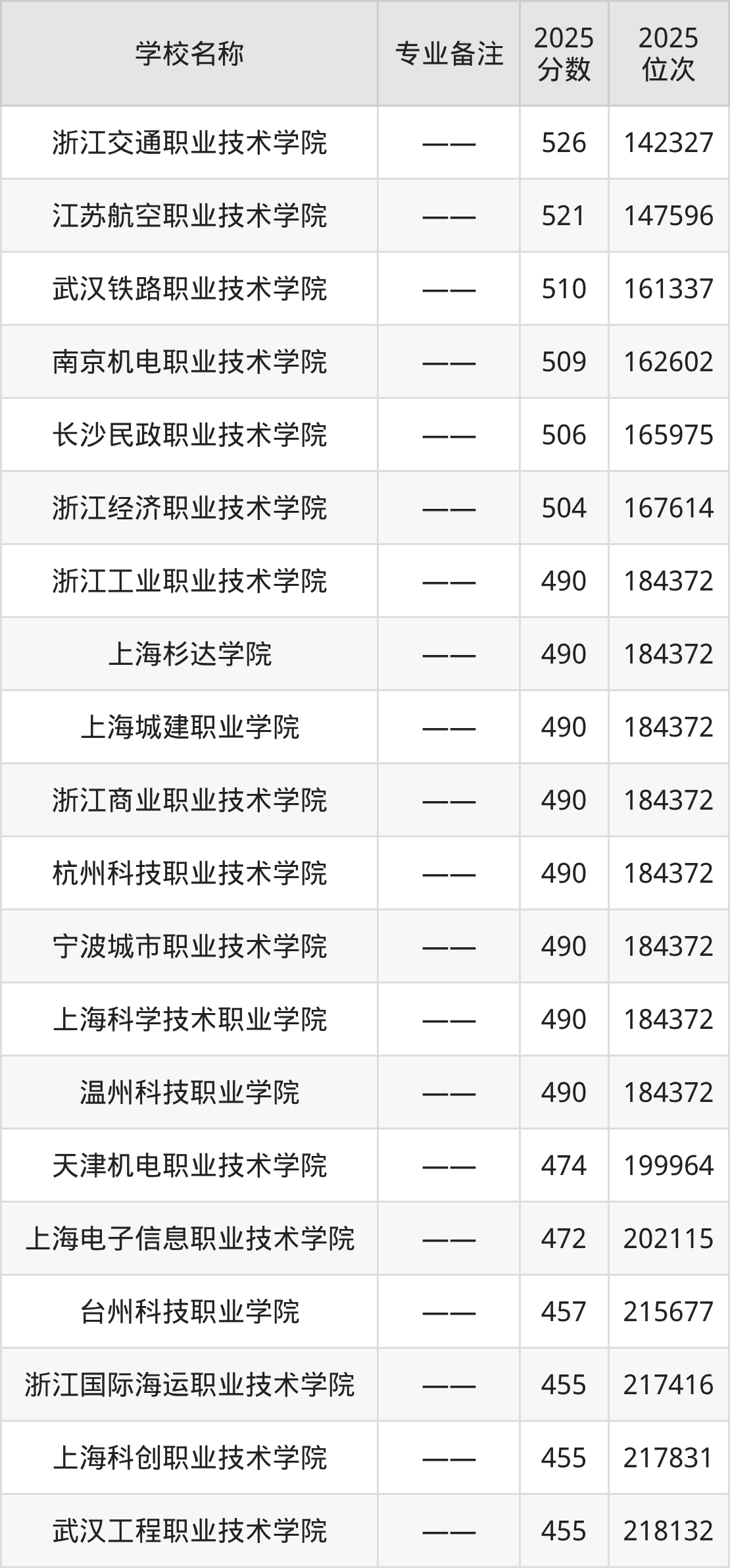 在浙江,分数线第一的智能控制技术专业大学是浙江交通职业技术学院,2025年投档线是526分,最低位次是142327位;
