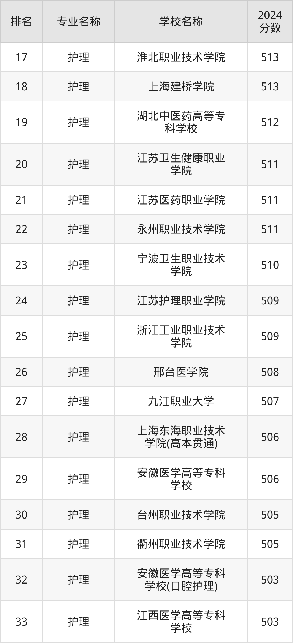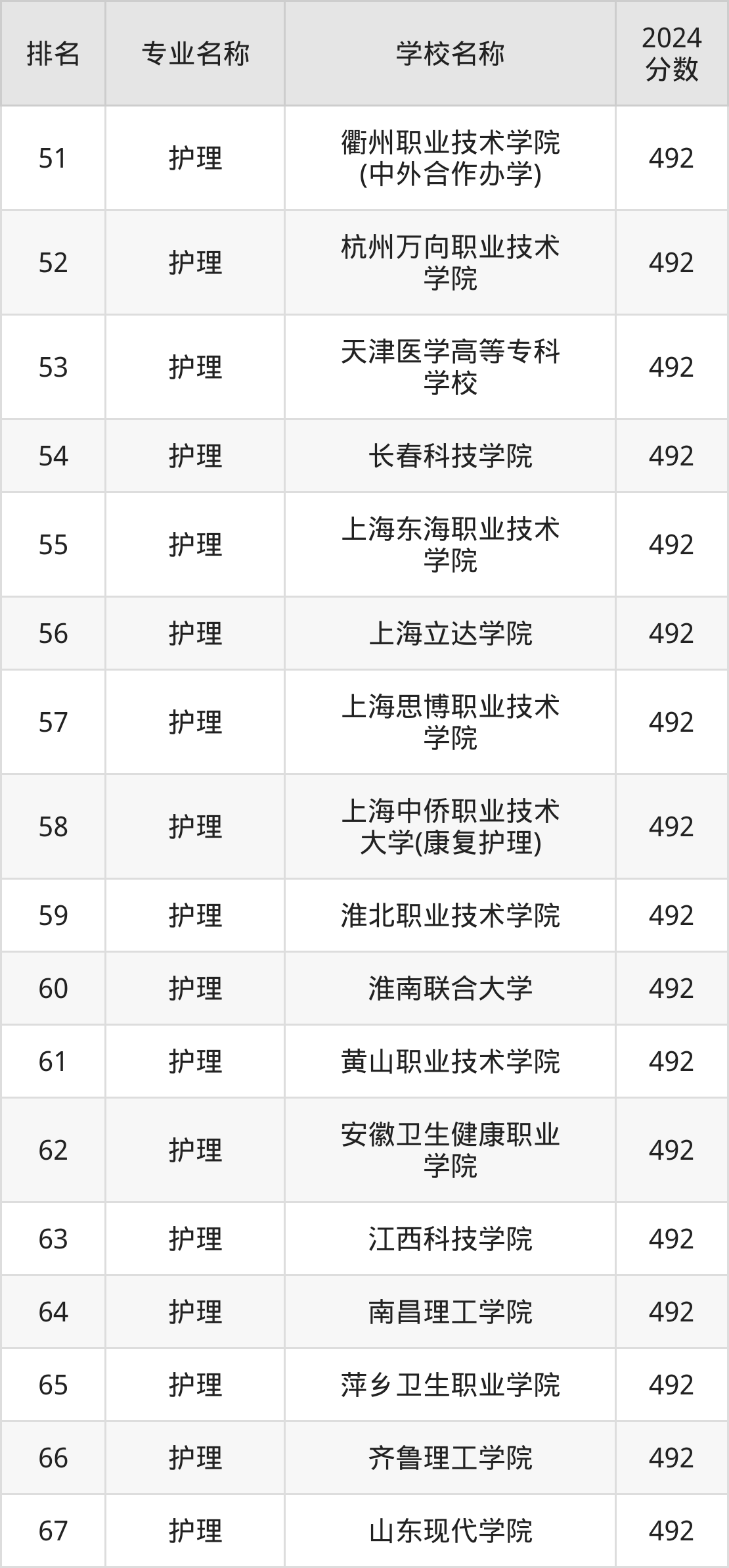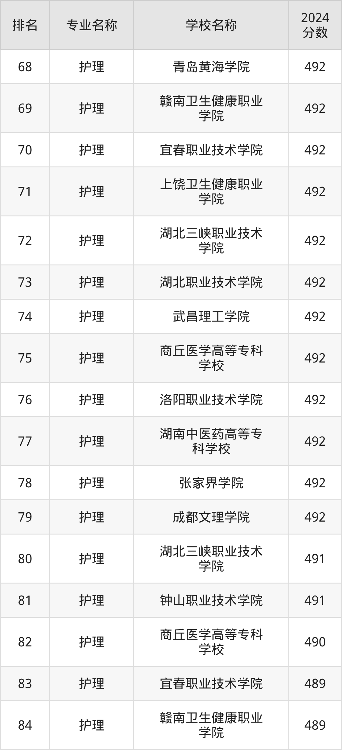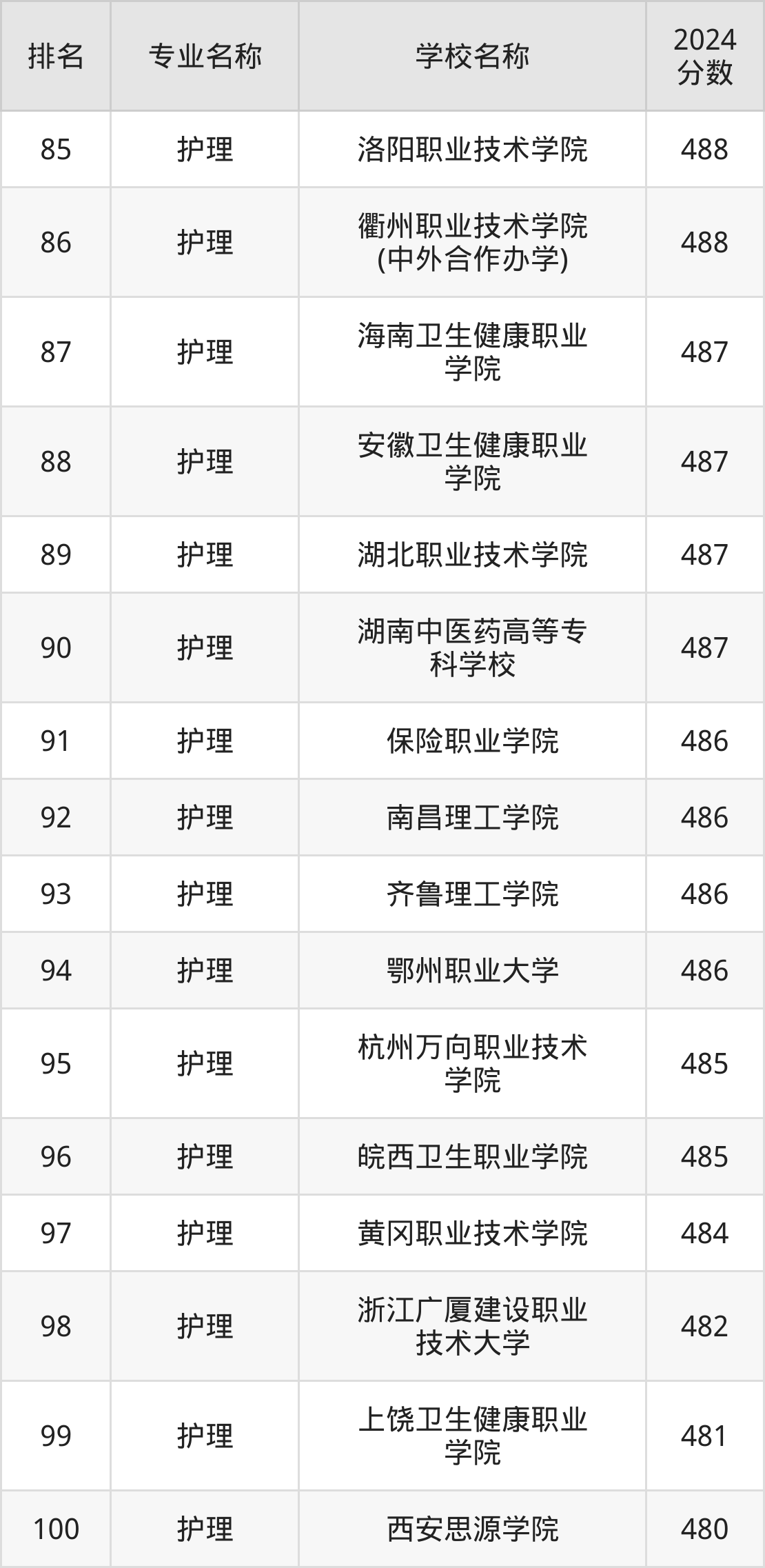 注:由于护理专业的开设院校数量庞大,本文整理出前100强的院校名单。
