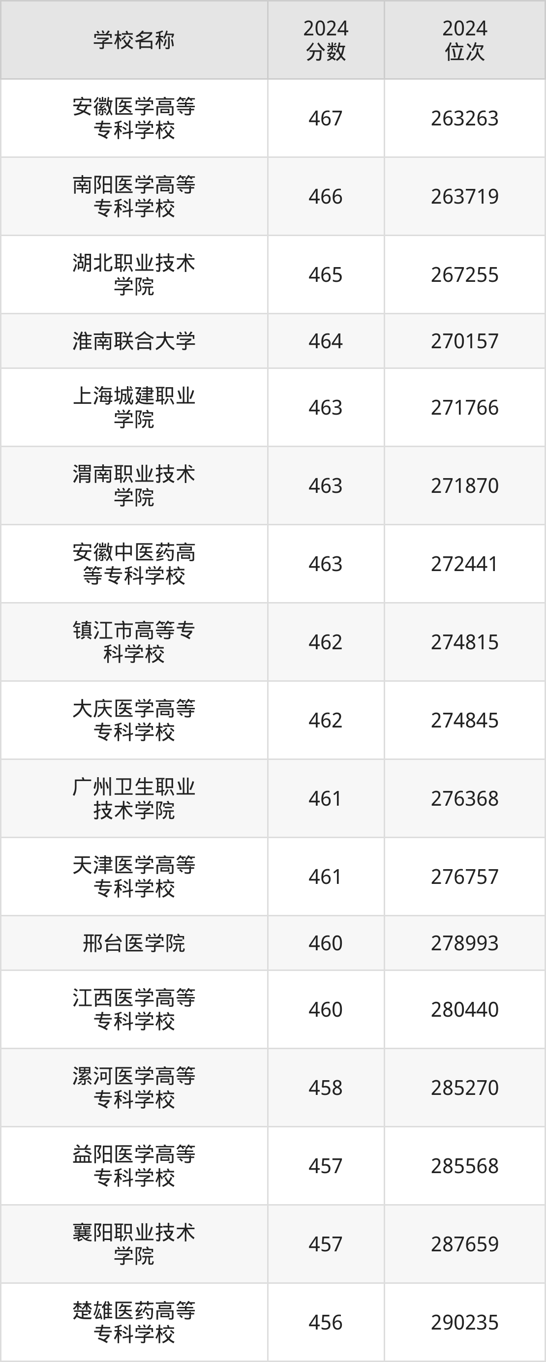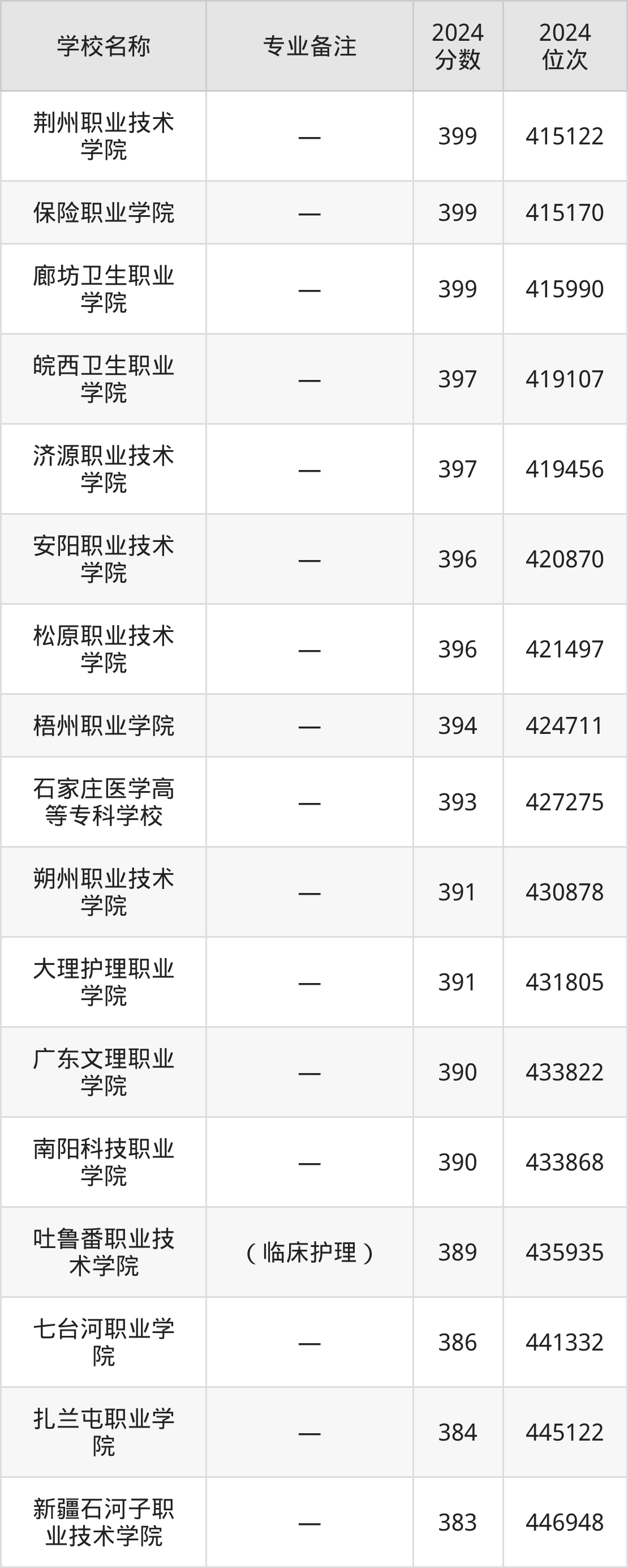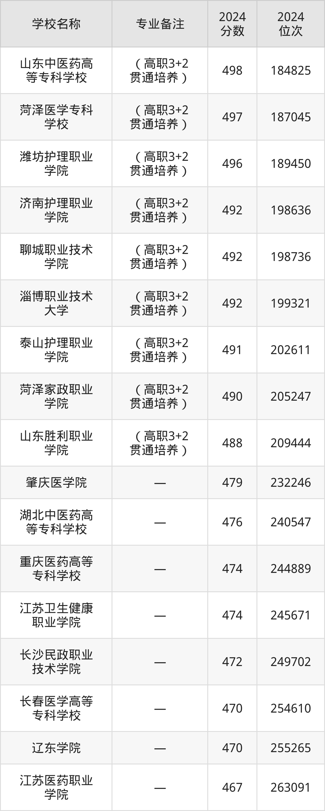 排在第二的护理专业大学是菏泽医学专科学校(高职3+2贯通培养),2024年投档线是497分,最低位次是187045位。