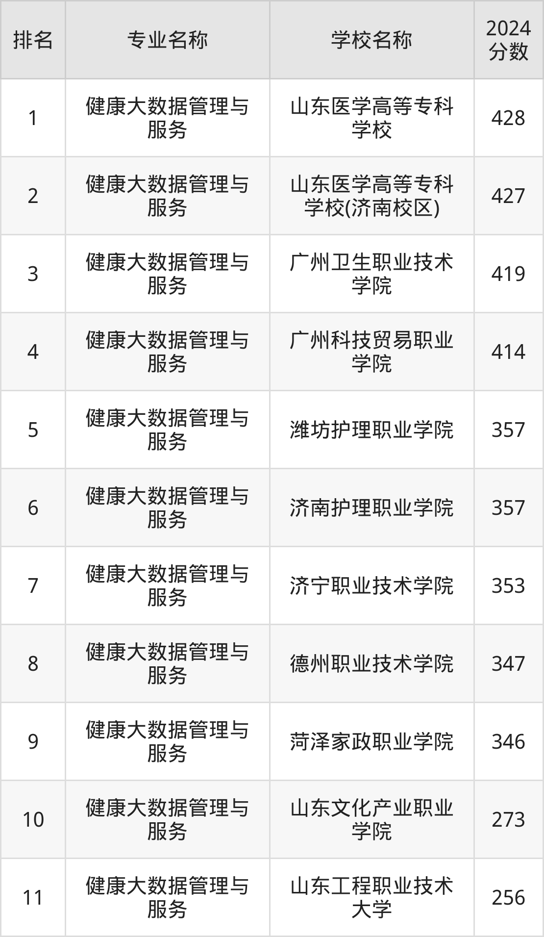 参考2024年山东各专业分数线,各大学健康大数据管理与服务专业的分数线为:山东医学高等专科学校428分、广州卫生职业技术学院419分等,更多数据详见下文。