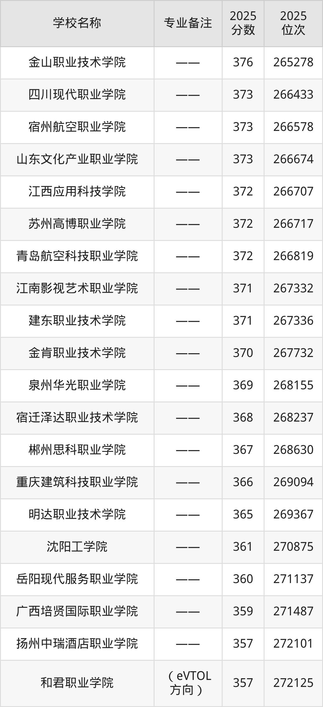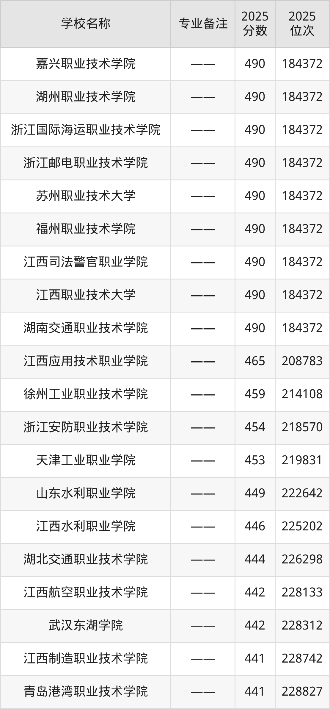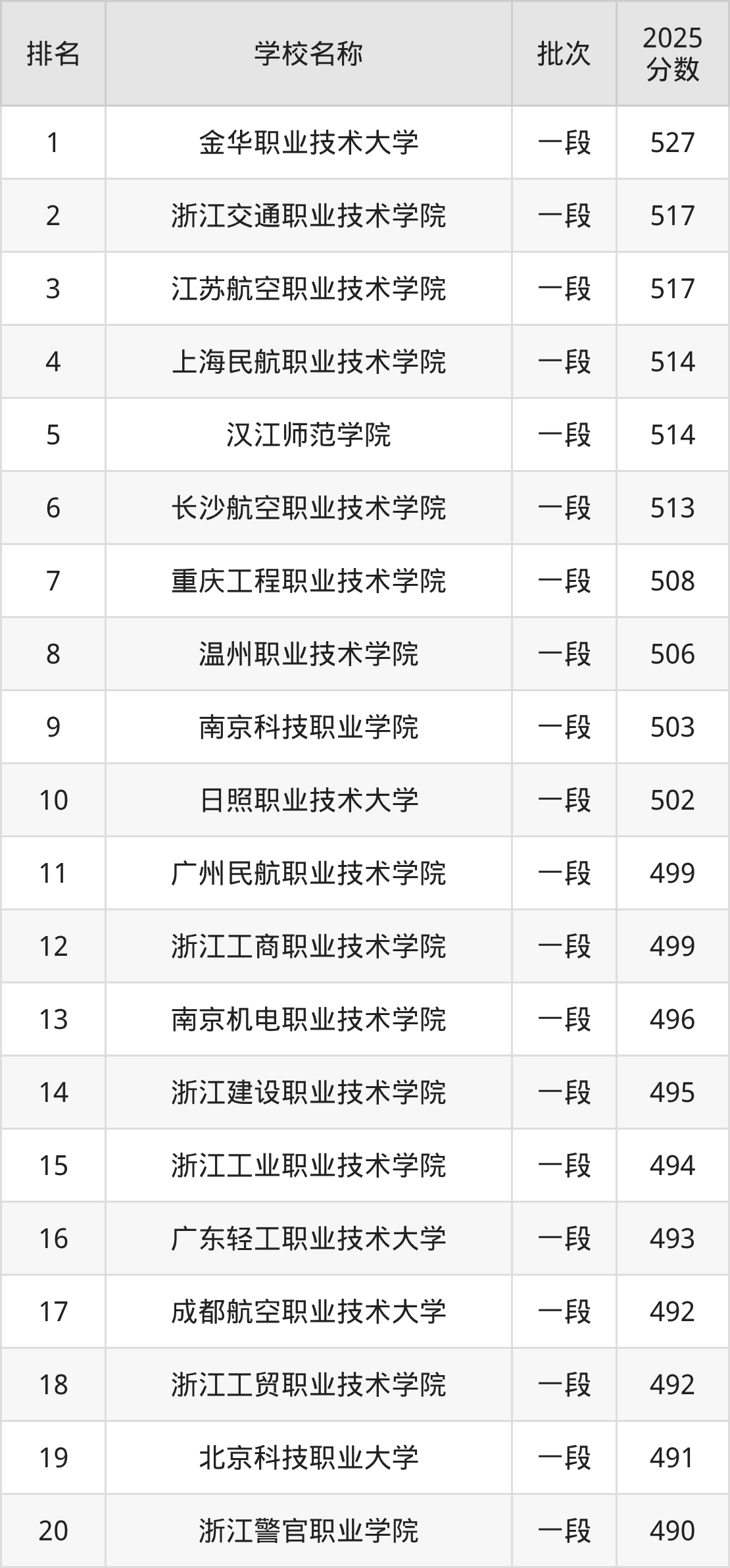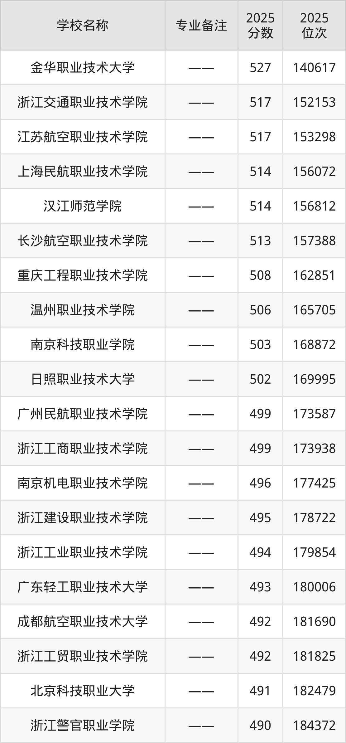 排在第二的无人机应用技术专业大学是浙江交通职业技术学院,2025年投档线是517分,最低位次是152153位。