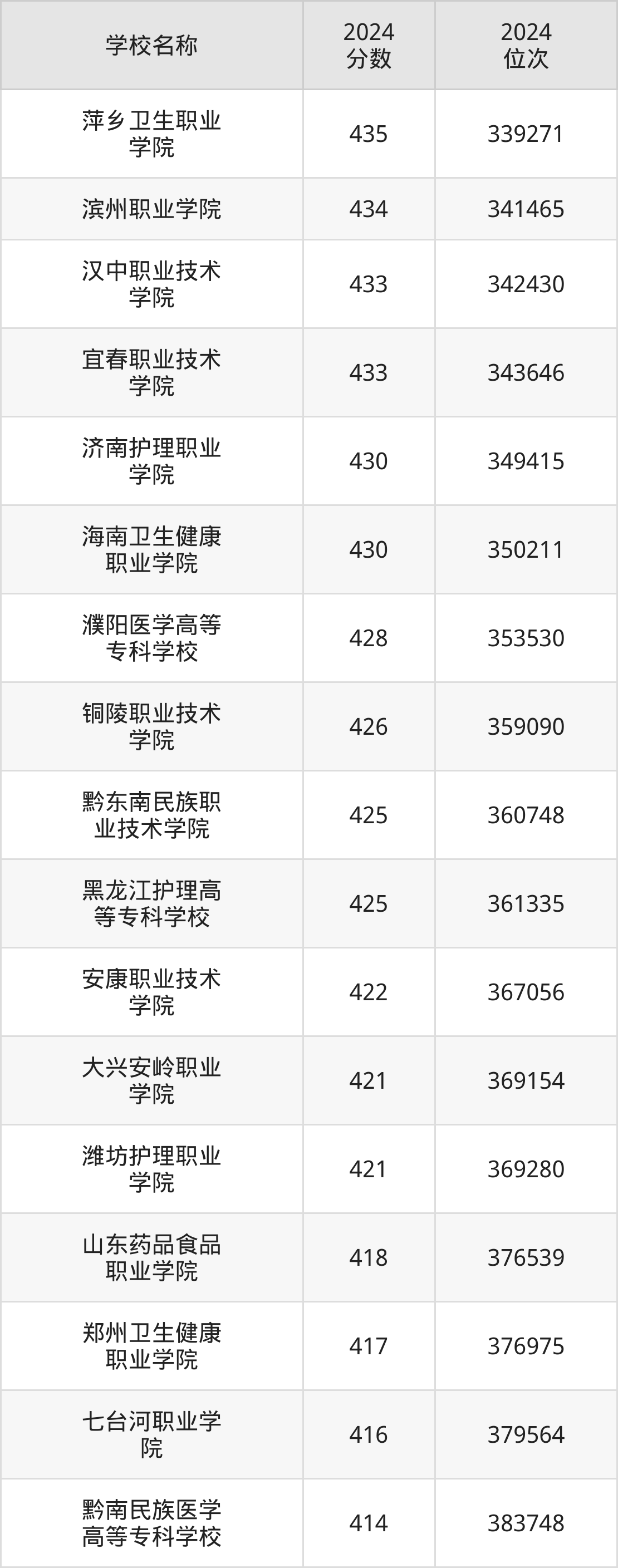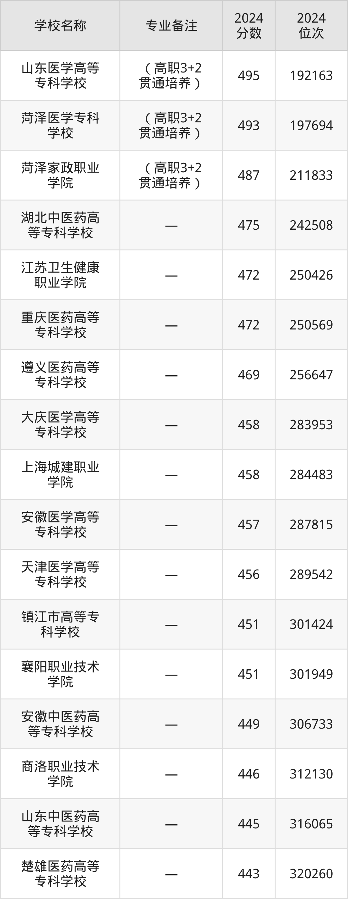 排在第二的医学检验技术专业大学是菏泽医学专科学校(高职3+2贯通培养),2024年投档线是493分,最低位次是197694位。