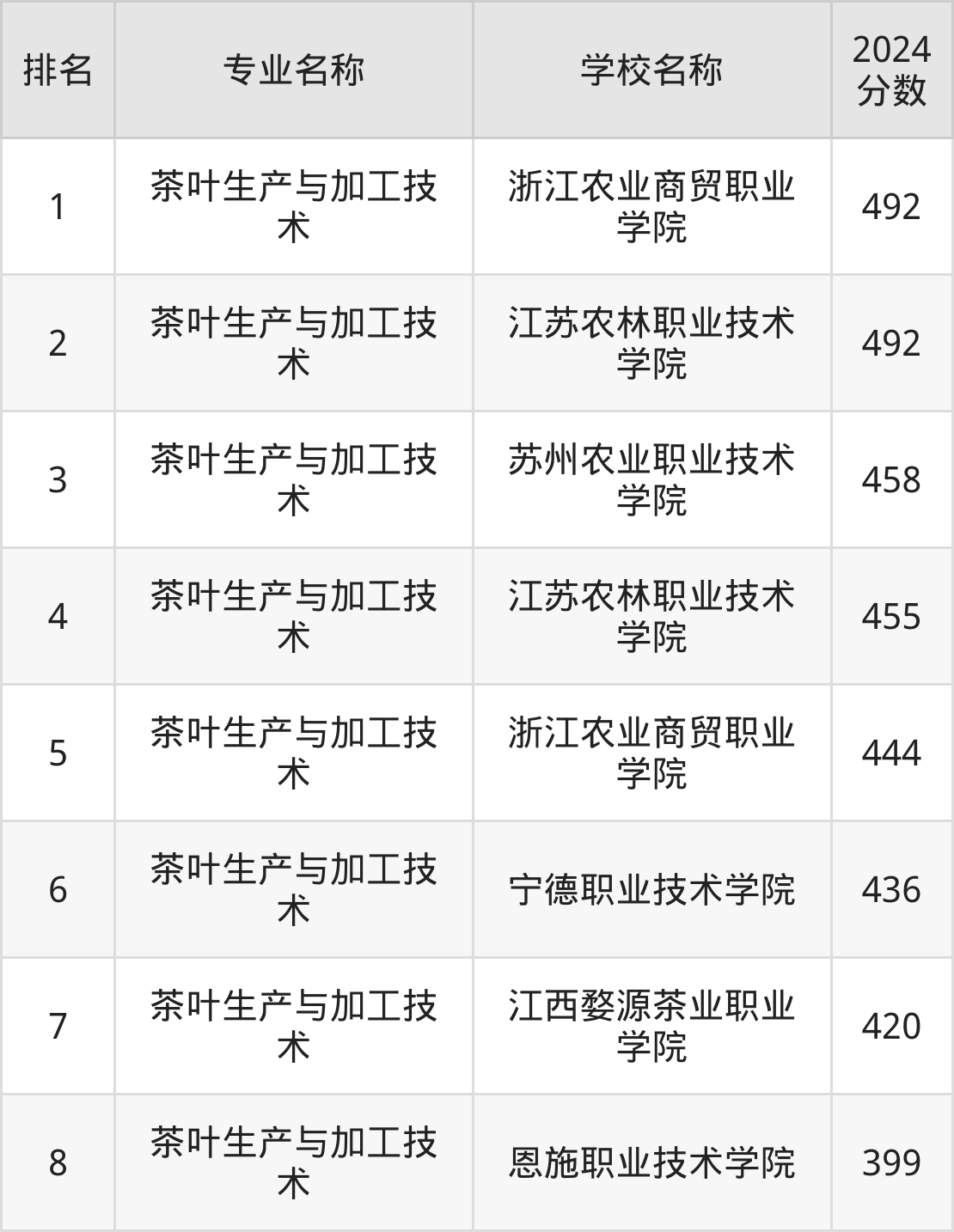 参考2024年山东各专业分数线,各大学茶叶生产与加工技术专业的分数线为:浙江农业商贸职业学院492分、江苏农林职业技术学院492分等,更多数据详见下文。