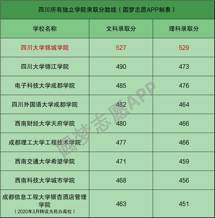 (3)独立学院:录取分数最高的为四川大学锦城学院,文科为527分,理科为529分,非常适合一些家庭条件好的一本压线考生报考。以下为独立学院具体录取情况: