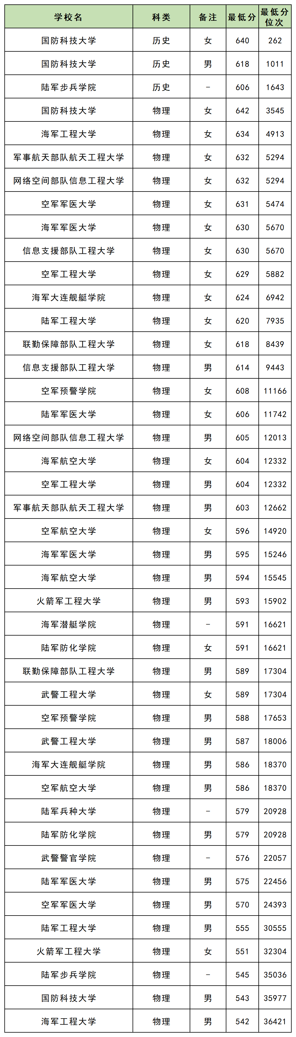 火箭军工程大学(物理类551分)、武警工程大学(物理类589分)、陆军防化学院(物理类591分)、空军航空大学(物理类596分)等。