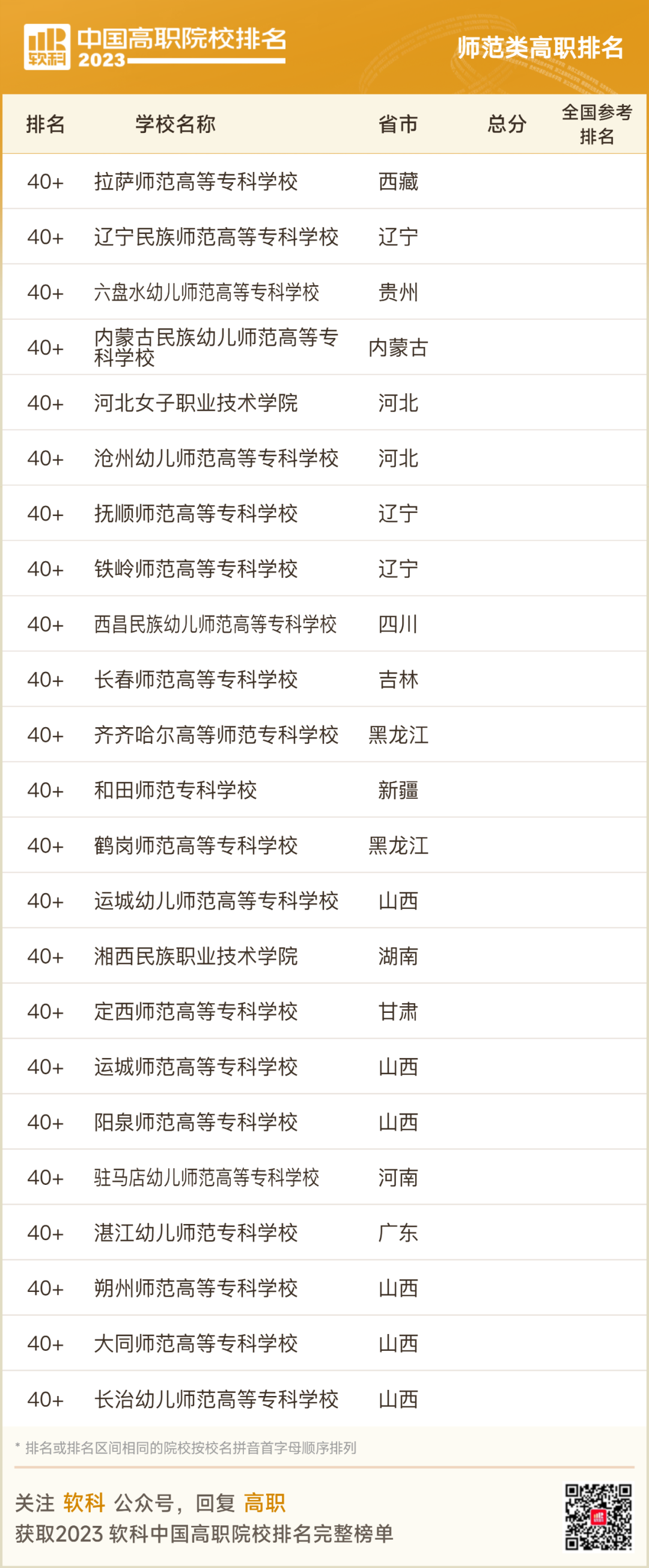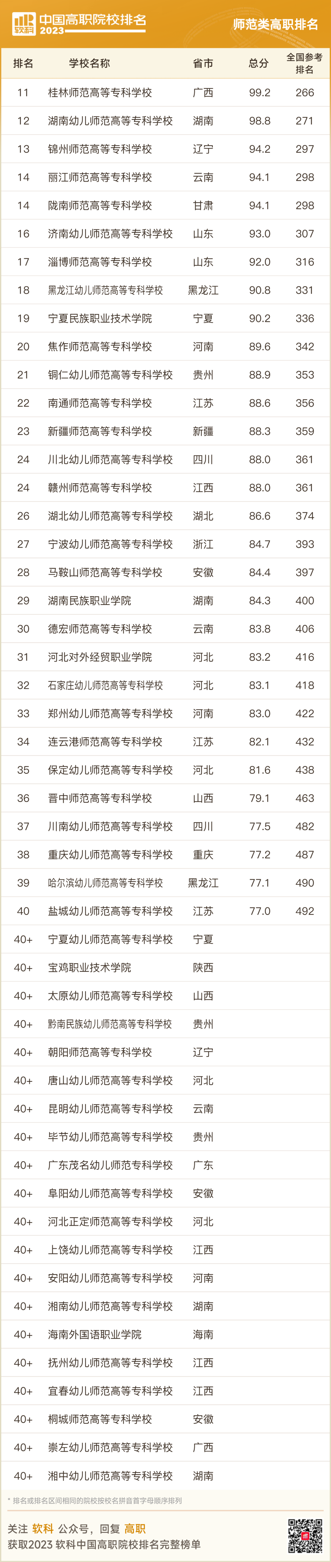 根据软科2023中国高职院校排名,师范类专科学校排名前十名分别是: