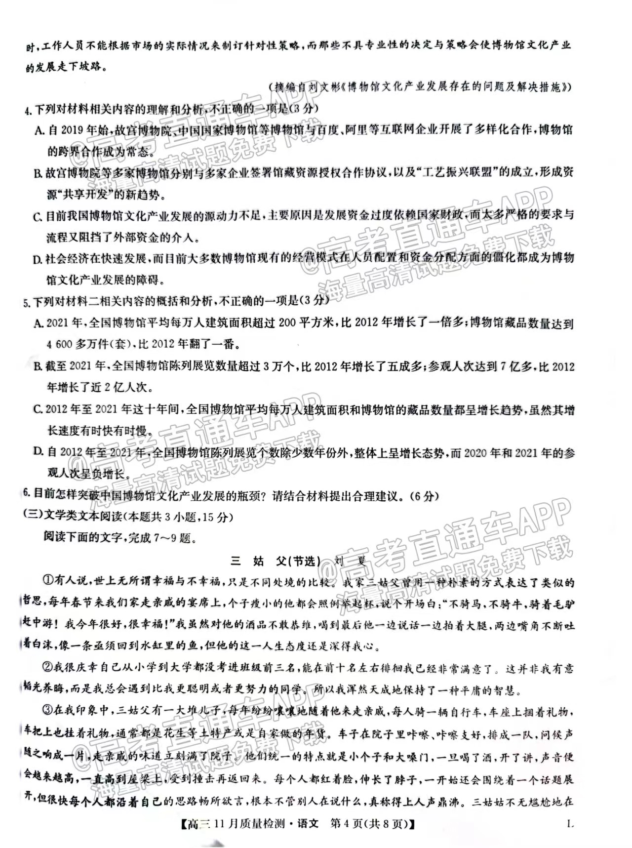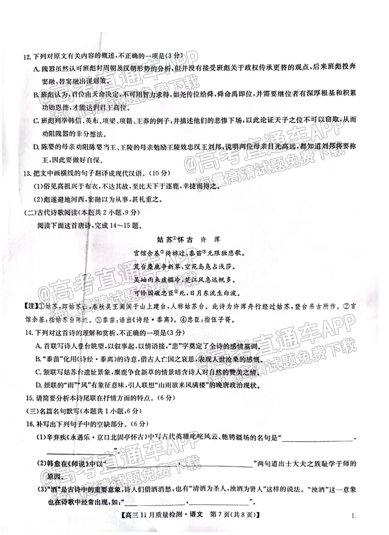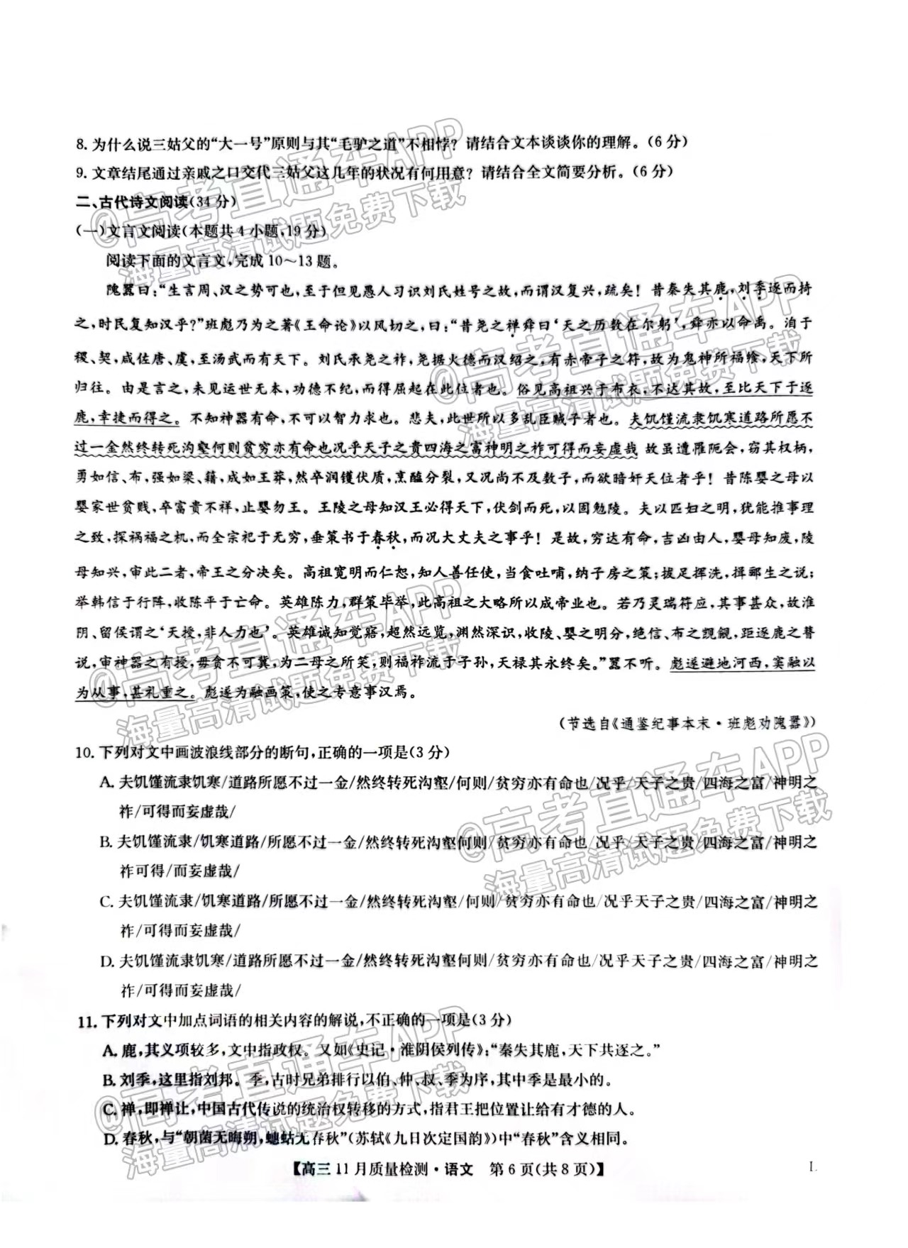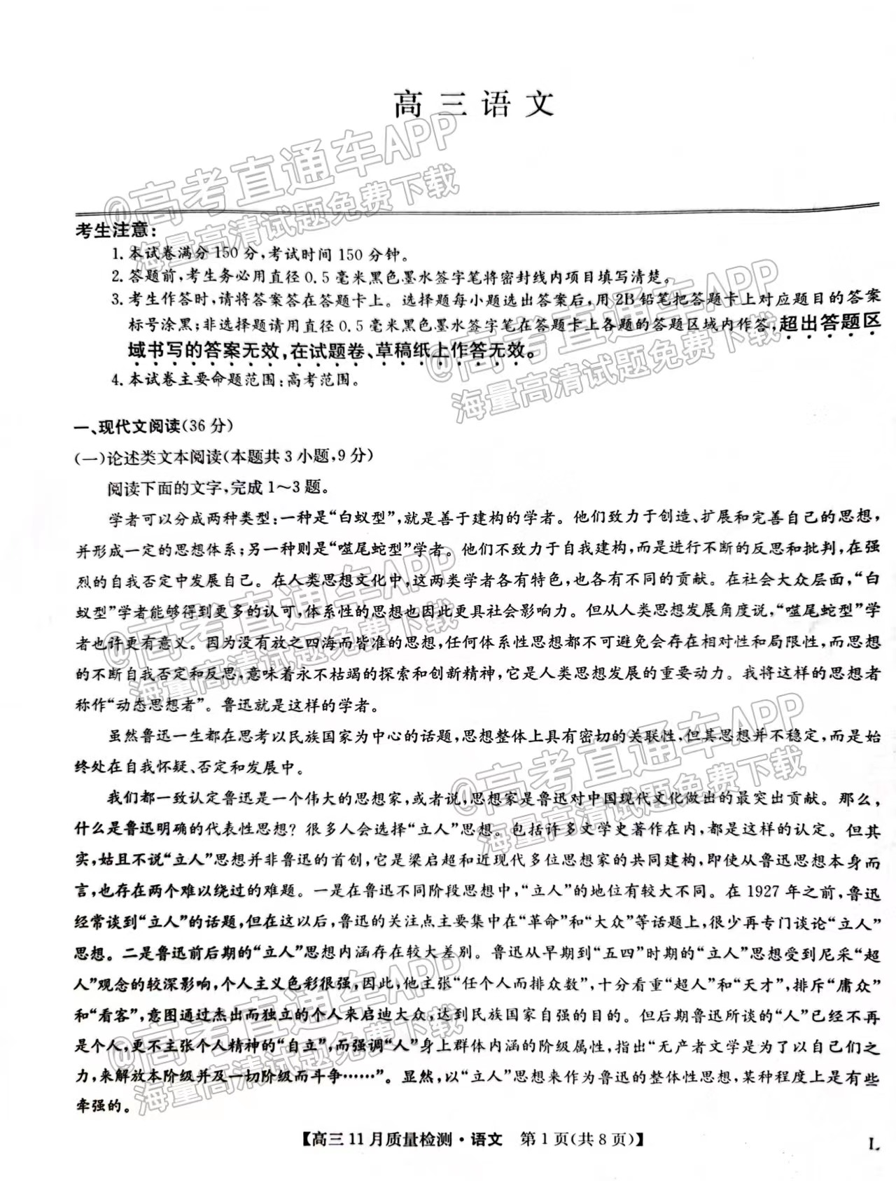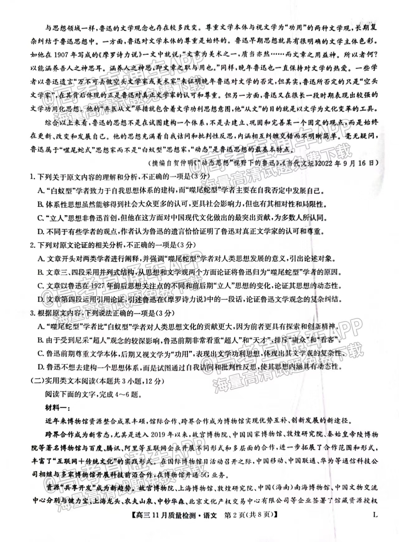 1.2023江西九师联盟高三11月联考语文试卷详情