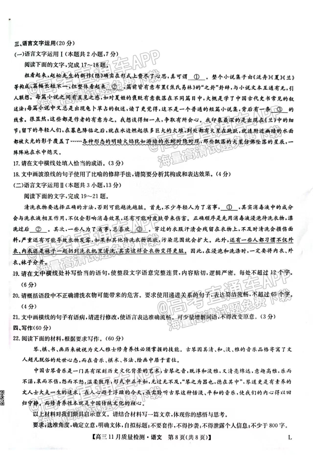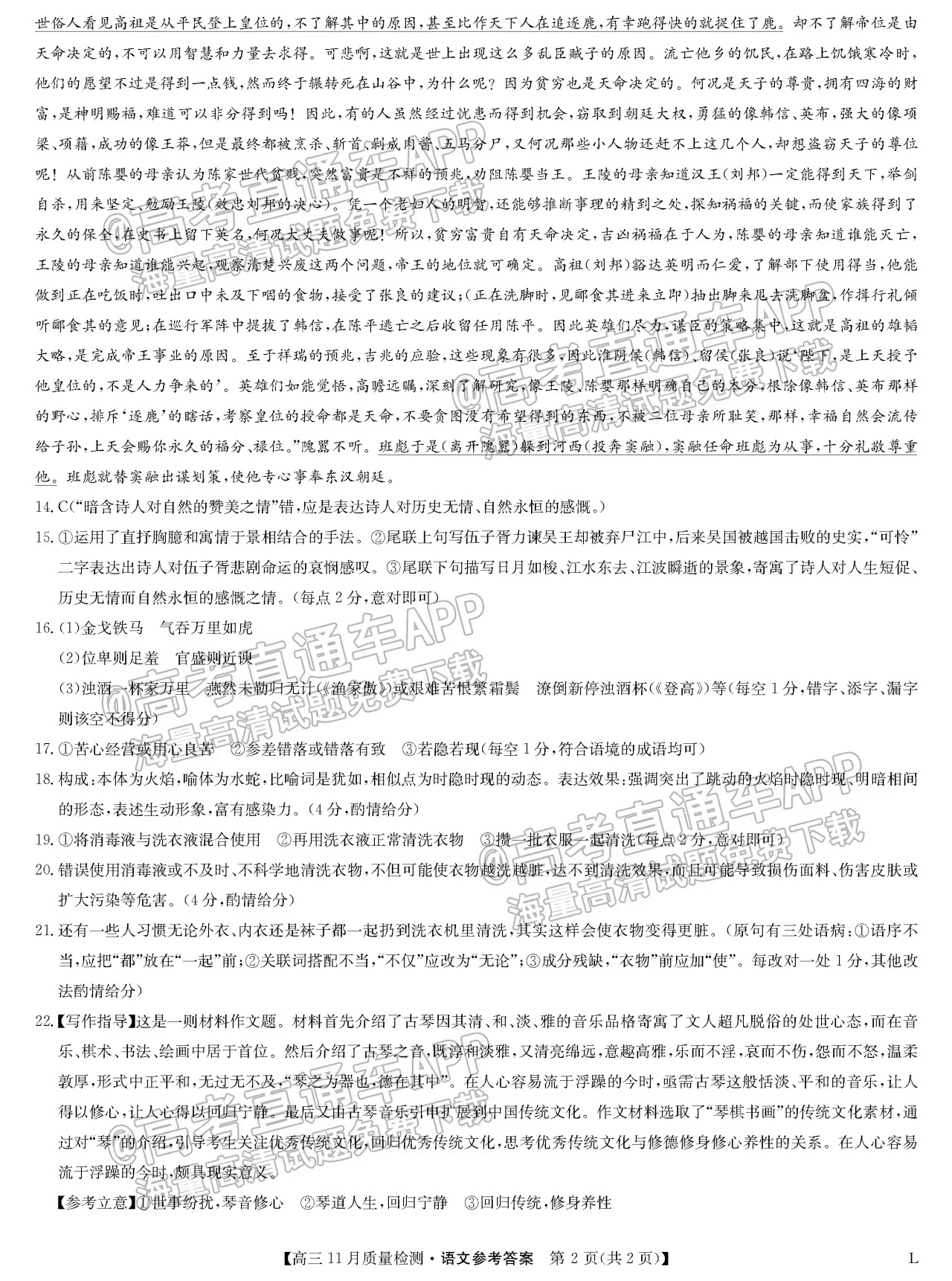 2023江西九师联盟将于11月24日开考,在此次考试中,包含的科目一共有9门,这9门科目分别是语文、数学、英语、物理、化学、生物、政治、历史、地理。以下是语文的试卷及答案详解,详情如下: