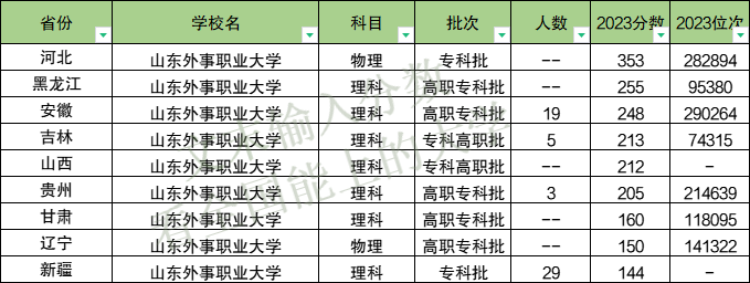 山东外事职业大学专科在新疆理科最低144分、河北物理类最低353分。本期将为大家整理2023年山东外事职业大学各省专科分数线,以及2024年在各省的招生计划人数。