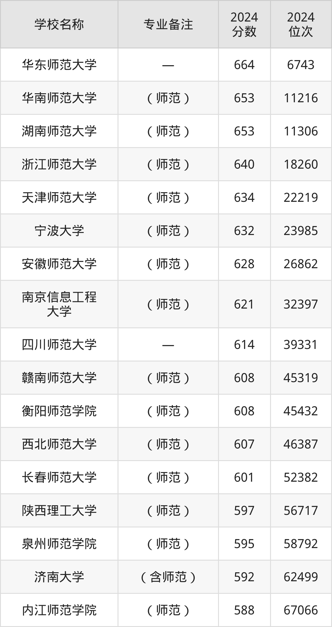 排在第二的地理科学专业大学是华南师范大学(师范),2024年投档线是653分,最低位次是11216位。