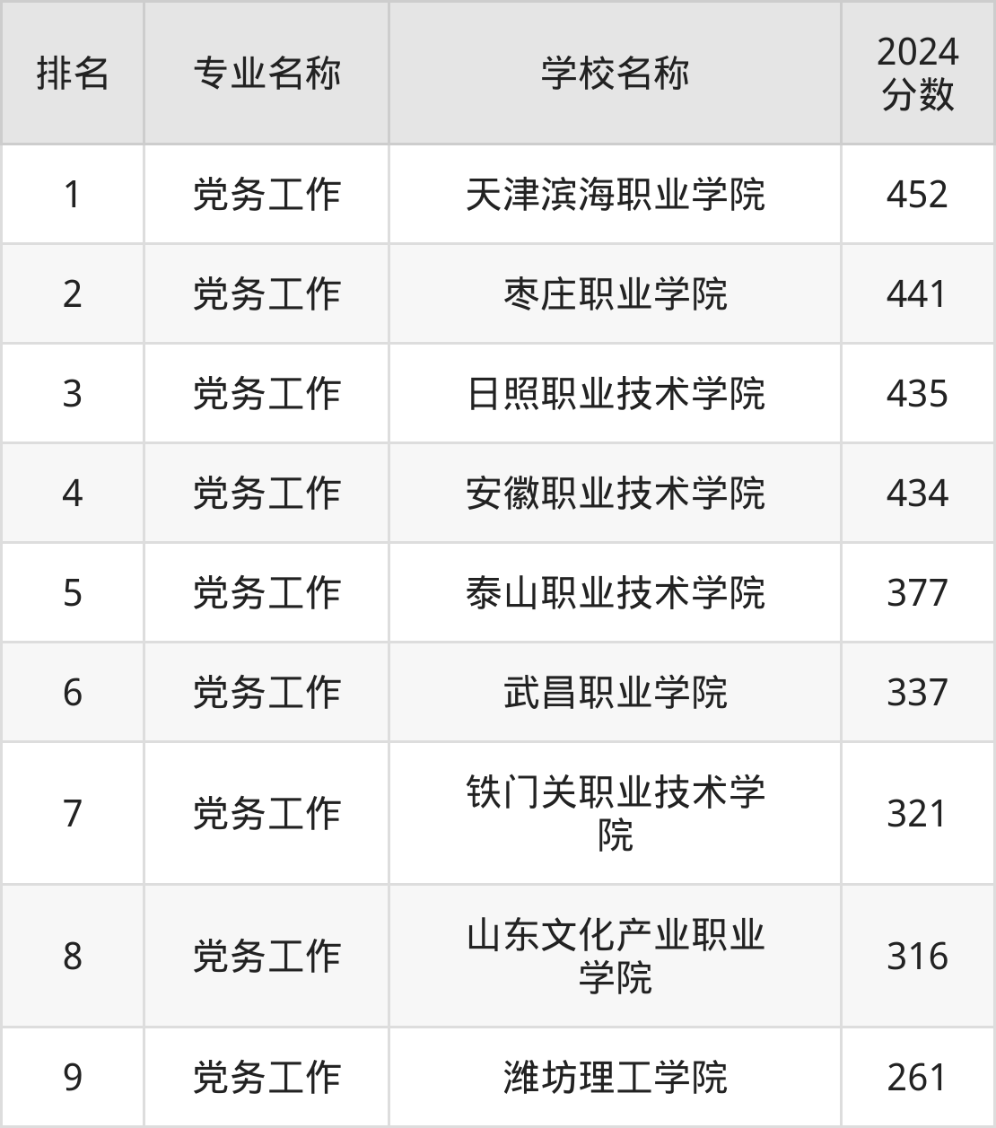 参考2024年山东各专业分数线,各大学党务工作专业的分数线为:天津滨海职业学院452分、枣庄职业学院441分等,更多数据详见下文。