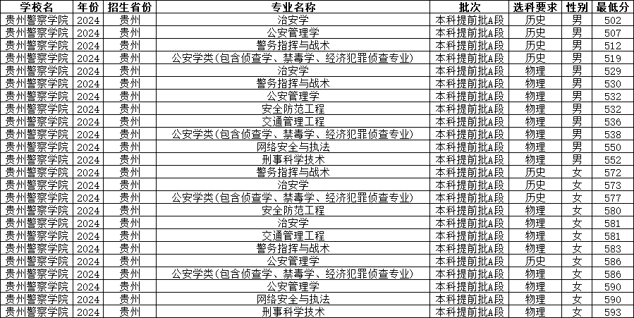 2024年贵州警校院校录取分数线最低分:贵州警察学院502分、浙江警官职业学院427分。