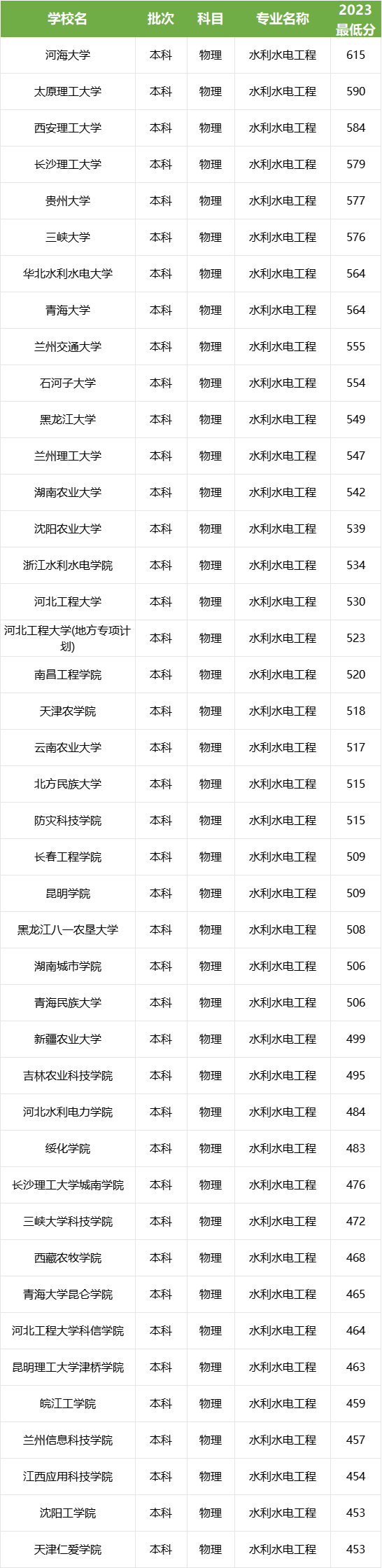 想要报考水利水电工程专业的同学,可以从下图中查看心仪大学水利水电工程专业的录取情况,如果超过2023年的分数,那么就说明有机会考上这所大学的水利水电工程专业哦。