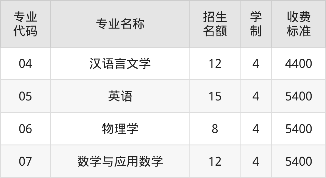 | 专业 代码 | 专业名称 | 招生 名额 | 学 制 | 收费 标准 |