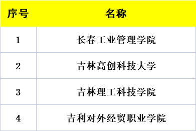 长春工业管理学院、吉林高创科技大学、吉林理工科技学院、吉利对外经贸职业学院。