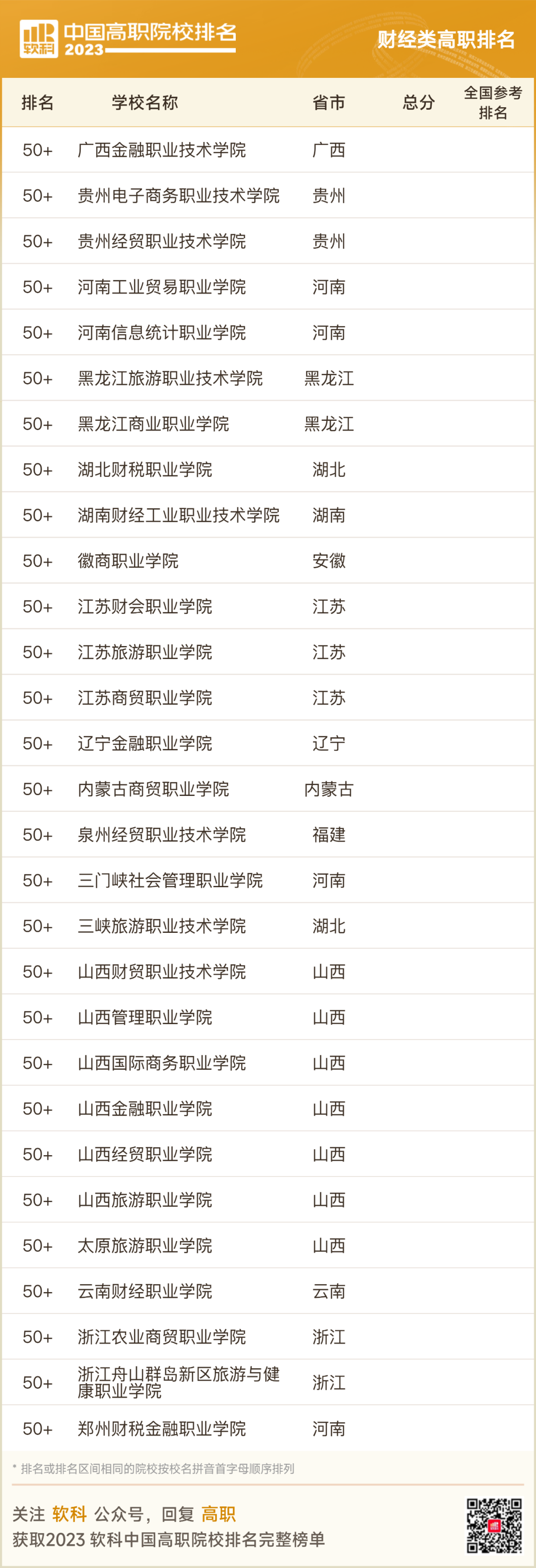 下面是软科2023财经类高职院校排名完整榜单(89所):