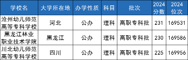 可以看到,分别有沧州幼儿师范高等专科学校、黑龙江林业职业技术学院、川北幼儿师范高等专科学校等。