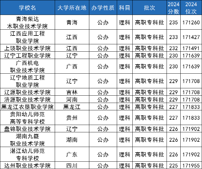2024年云南省的230分左右(225-235分)能上的公办专科大学一共有14所,均为高职专科批次录取的院校。