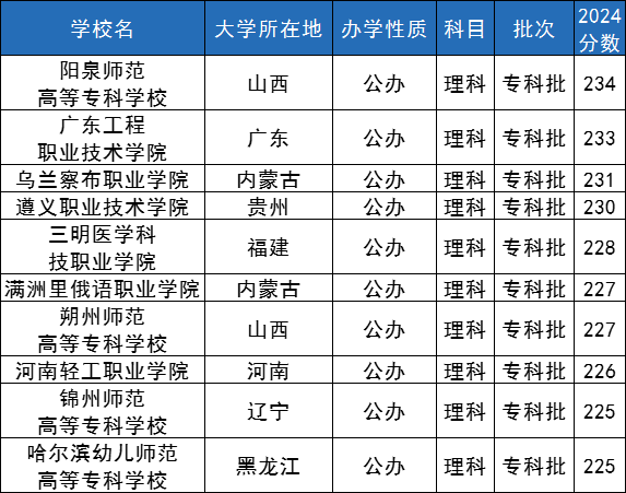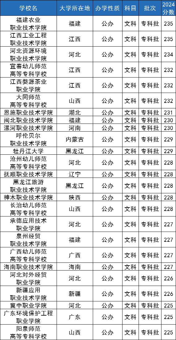 2024年山西省的230分左右(225-235分)能上的公办专科大学一共有34所,均为专科批次录取的院校。