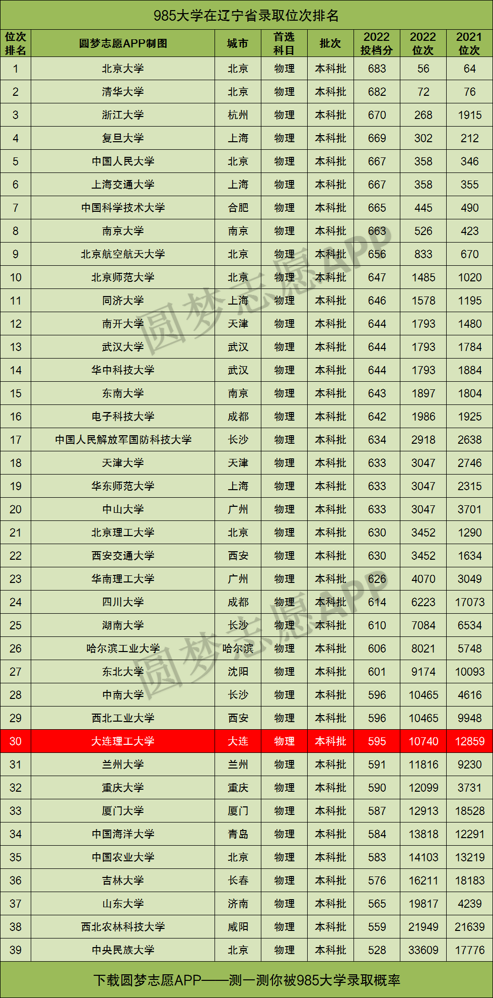 下图为,全国985大学在辽宁省物理类的位次排名,以2022年最低位次为标准进行的排序。其中大连理工大学排在第30位: