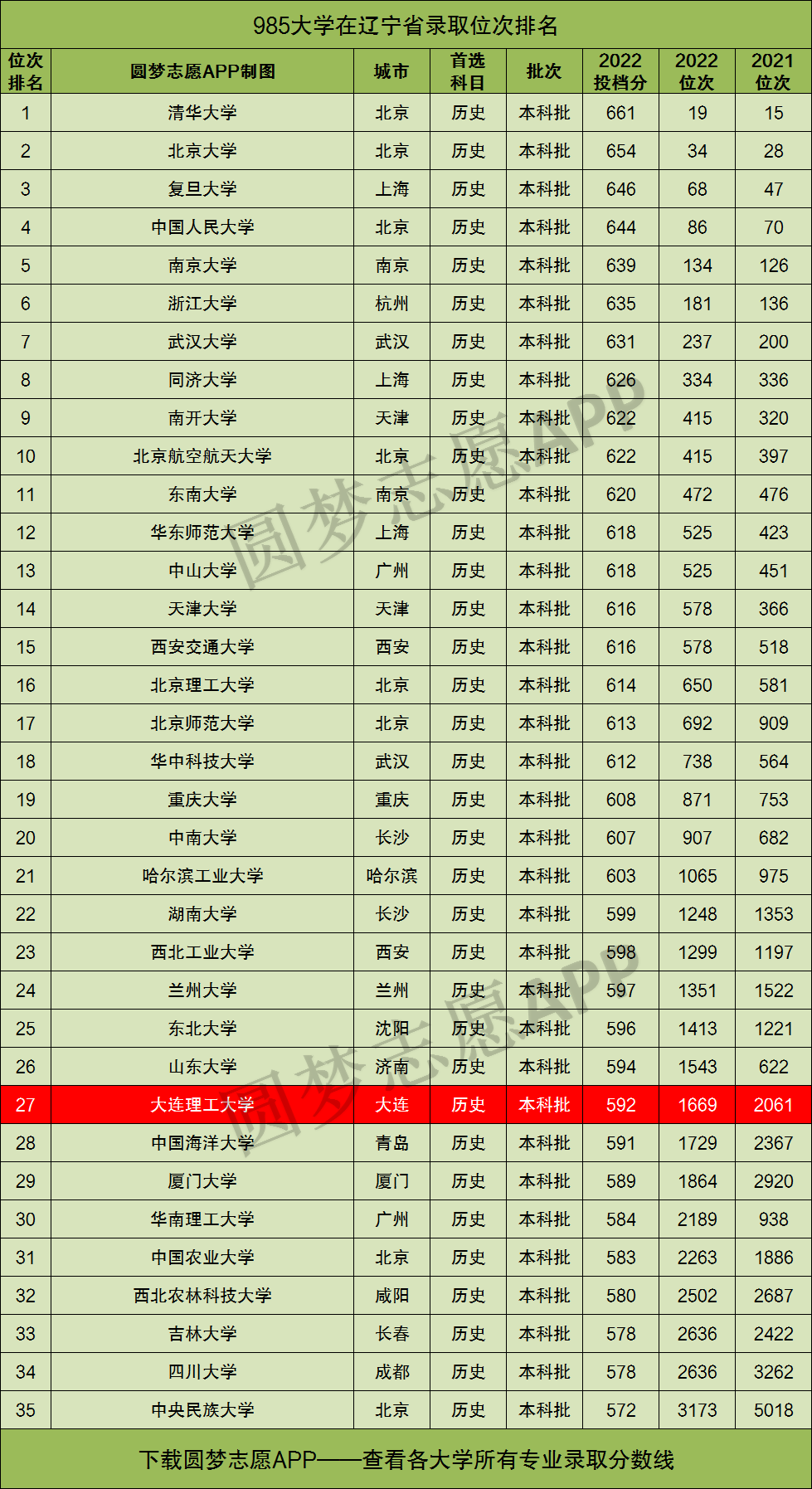 下图为全国985大学在辽宁省历史类的录取位次排名,其中大连理工大学排在全国985大学中的第27名。