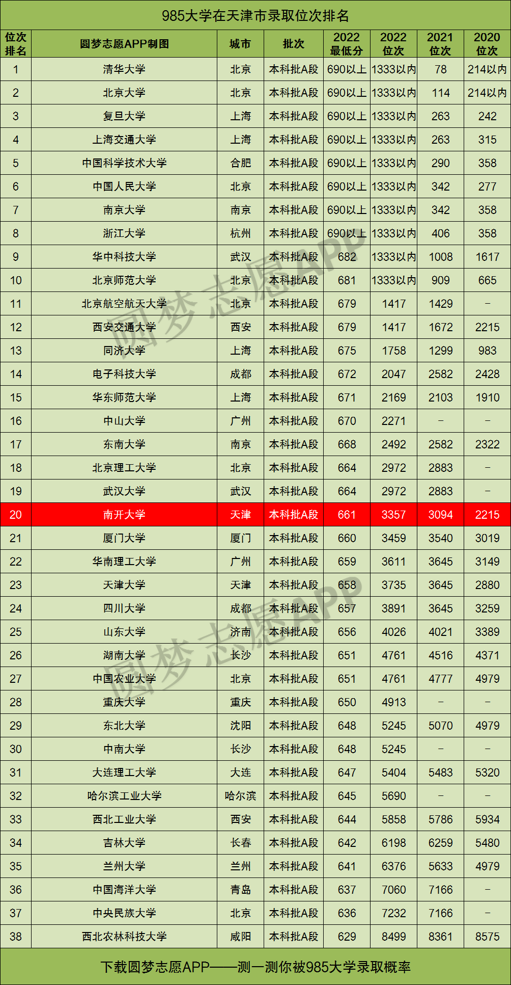 下图为,全国985大学在天津市的位次排名,以2022年最低位次为标准进行的排序。其中南开大学排在第20位: