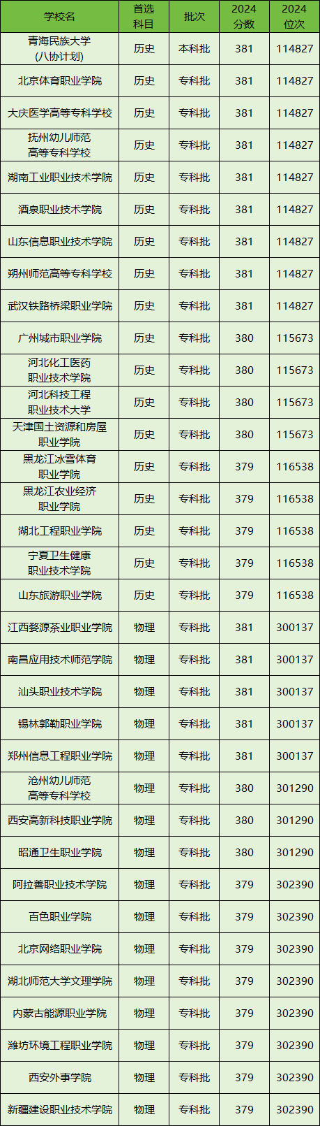 379分到381分的所有大学名单如下(除青海民族大学(八协计划)是本科院校外,其余均为专科学校):