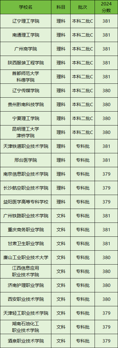 其中文科2024年分数线刚好是380分的有唐山工业职业技术大学、江西信息应用职业技术学院、济南护理职业学院、西安职业技术学院;理科2024年分数线刚好是380分的都是本科院校,有辽宁传媒学院、贵州黔南科技学院、宁夏理工学院、昆明理工大学津桥学院。