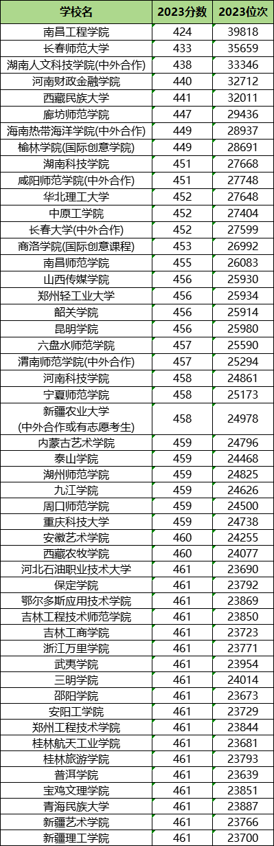 最好考、收分最低的公办二本大学有南昌工程学院、长春师范大学、湖南人文科技学院(中外合作),这些学校2023文科最低投档分为424分,比陕西二本分数线高21分,考生可捡漏。