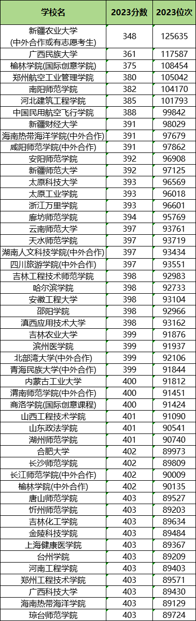 最好考、收分最低的公办二本大学有新疆农业大学(中外合作或有志愿考生)、广西民族大学、榆林学院(国际创意学院)、郑州航空工业管理学院,这些学校中2023理科最低投档分为348分,比陕西二本线高12分,考生可捡漏。