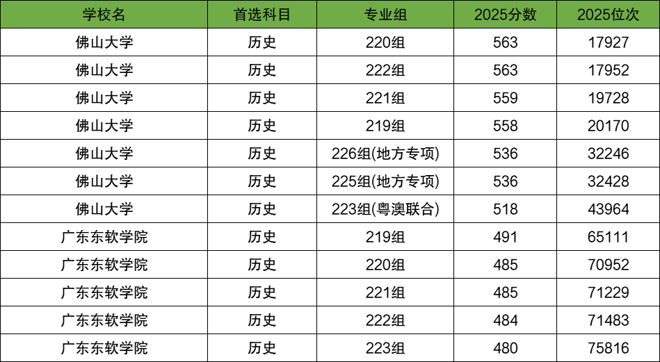 2025年佛山本科各大学专业组录取分数线(历史类):