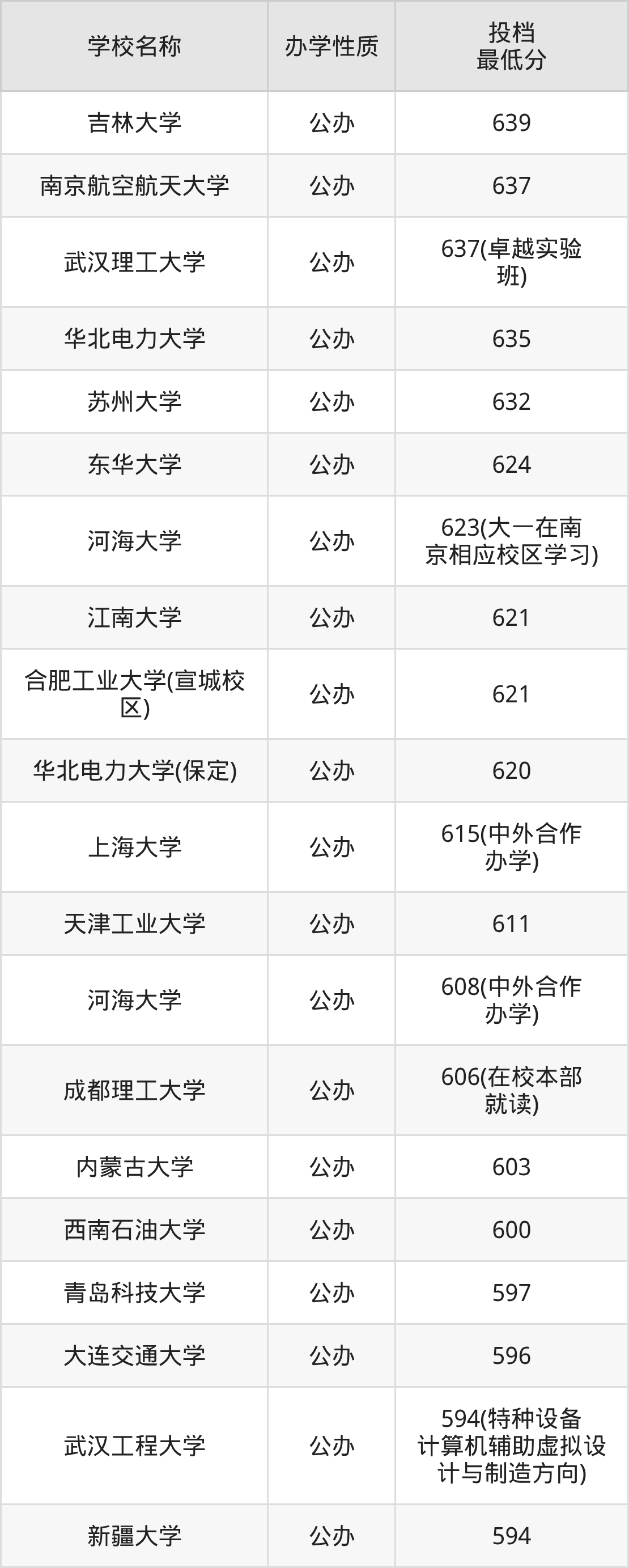 600分左右的机械工程大学:西南石油大学600分、内蒙古大学603分、成都理工大学606分、河海大学608分(中外合作办学);